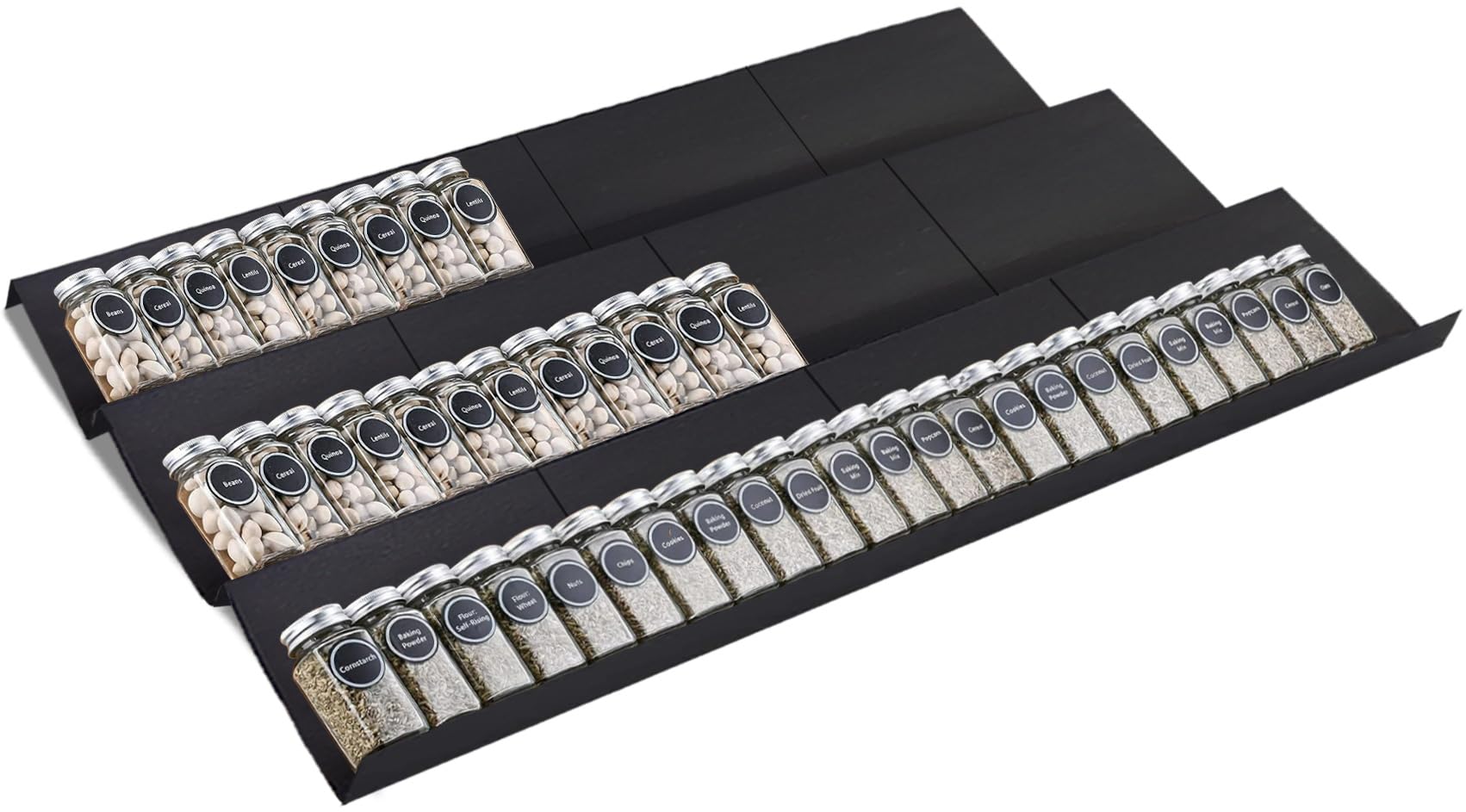 - Large Capacity to Save Storage Space - The spice rack tray is designed at an inclined Angle so that the label can be clearly seen, which is easy to locate and quickly grab the required items. Tiered spice rack for drawer saves a lot of storage space for your drawers and cabinets. Large capacity, can hold up to 48 standard ordinary spice jars.
