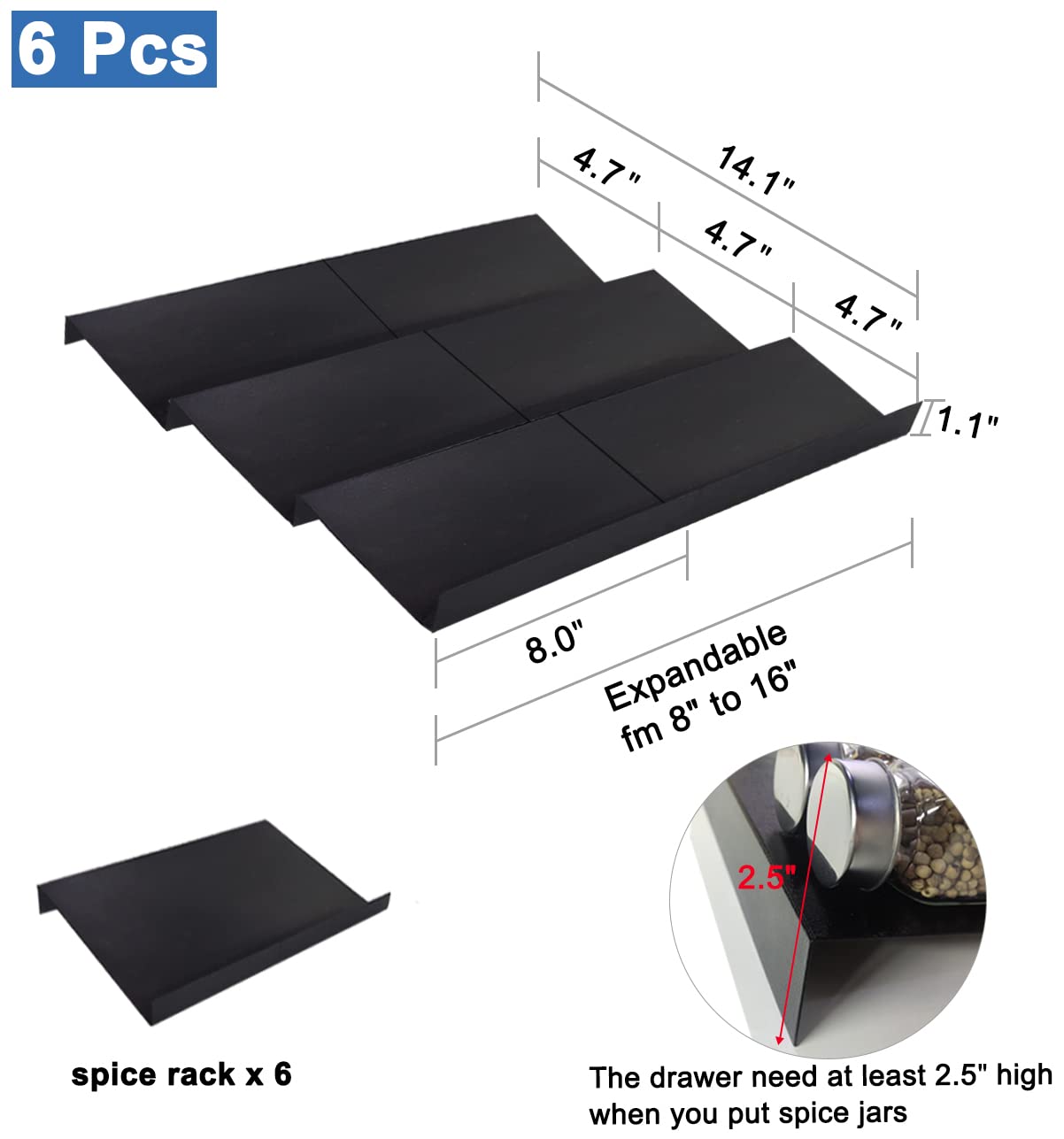 - Extendable to Accommodate any Cabinet Size - Multiple racks make up of multiple sizes to accommodate cabinets. Each individual spice rack measures 4.7W x 8L x 1.1H in. The 6 pieces set consists of 6 individual spice racks measuring 14.1W x 16L x 1.1H inches. Expands from 8 to 16 wide. The minimum drawer depth for the spice pot should be about 2.5 inches.