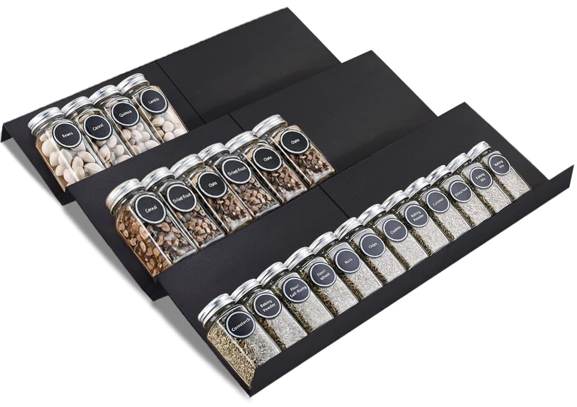 - Large Capacity to Save Storage Space - The spice rack tray is designed at an inclined Angle so that the label can be clearly seen, which is easy to locate and quickly grab the required items. Tiered spice rack for drawer saves a lot of storage space for your drawers and cabinets. Large capacity, can hold up to 24 standard ordinary spice jars.