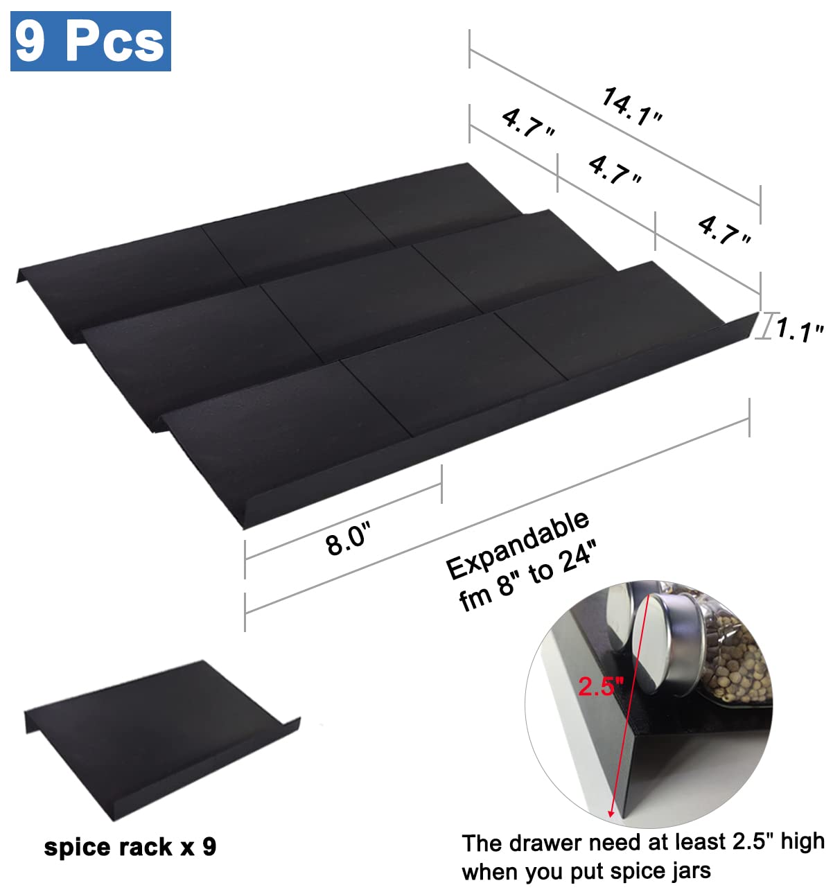 Size: Each spice organizer for drawer is 4.7W x 8L x 1.1H inches; The 9-piece set can be expanded to 14.1W x 24L x 1.1H inches