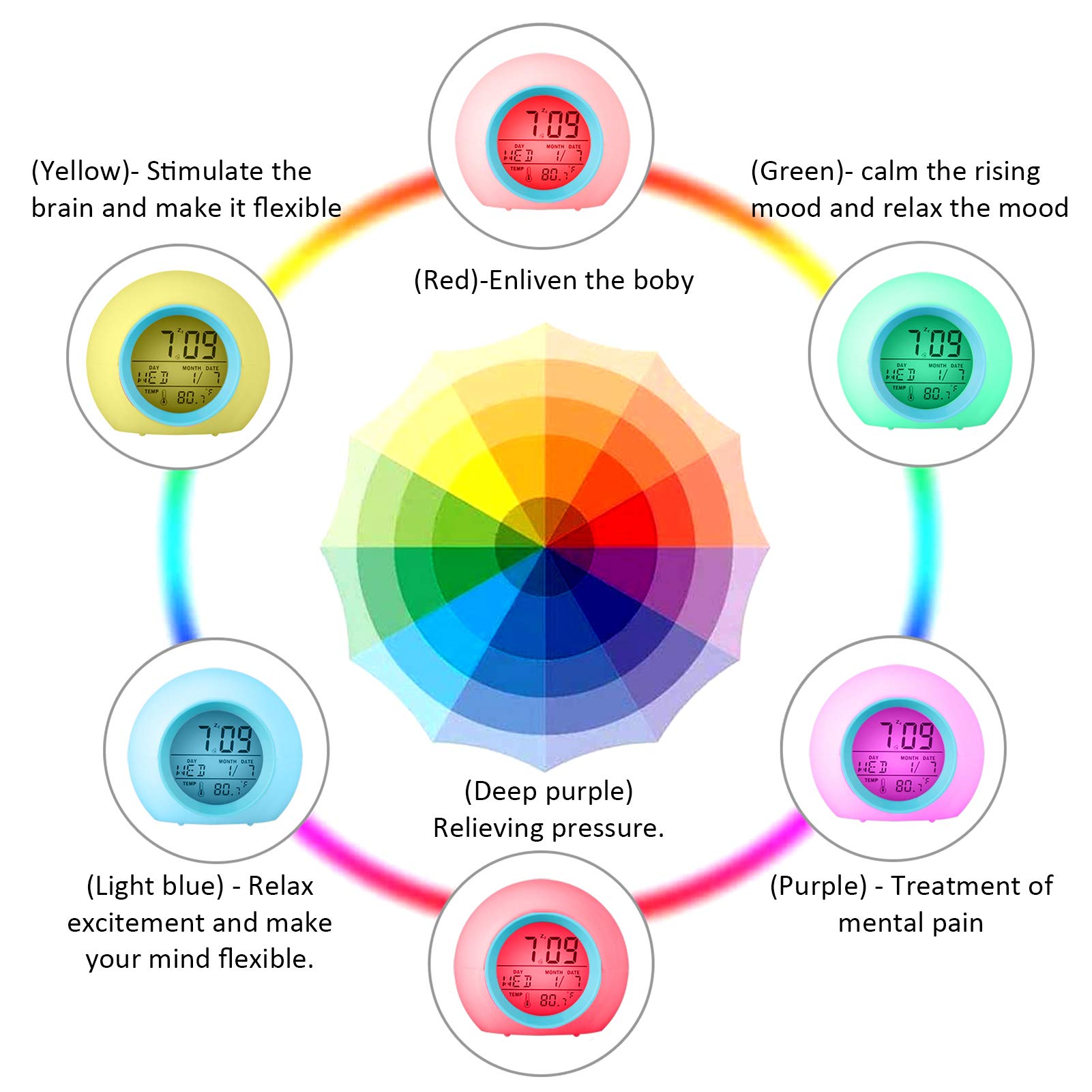 - 7 Color Night LightThis kids alarm clocks has 7 rainbow color night light, It can be used as a wake up light, multicolored night lights, mood night light, atmosphere lighting,kids bedroom clocks, and will reflect the stars and moon.