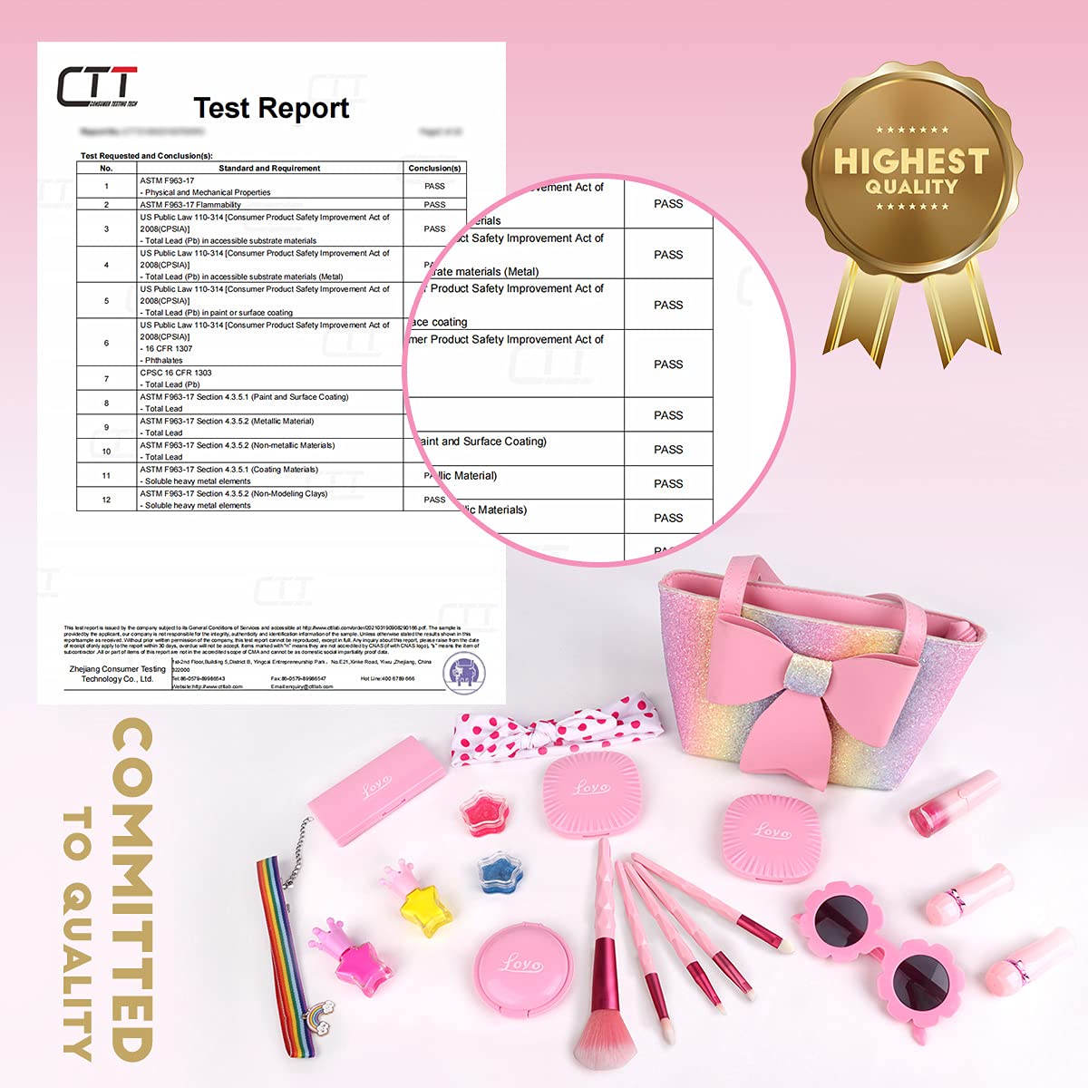 - KIDS-FRIENDLY MAKEUP INGREDIENTS GONE THROUGH SAFETY TEST & EASILY WASHABLE: Washable LOYO makeup set are use water-soluble formula, no added preservatives, mild and non-irritating, no burden on the skin. It can be washed directly with soap and water, easy to clean, not irritating to ensure your children are safe to play. Let your kid spend hours and hours exploring and learning about her first makeup collection.