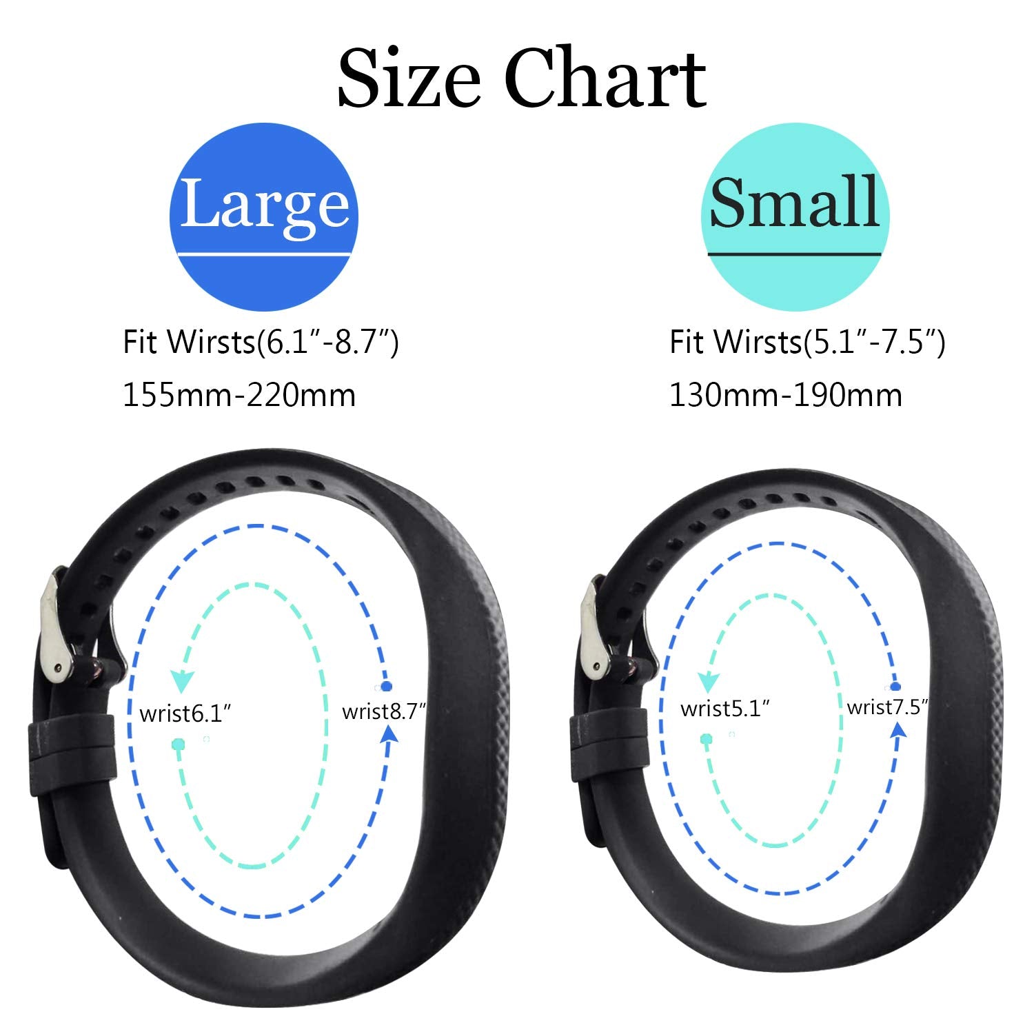 - Adjustable size Small size fits for wrist at 5.5 - 7.1 circumstance. Large size fits for wrists at 6.5 -8.7 circumstance. Stainless Steel Buckle, easy to assemble and adjust, secure your watch during strenuous exercise.