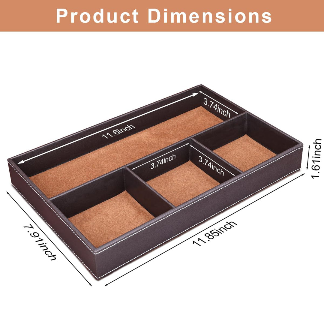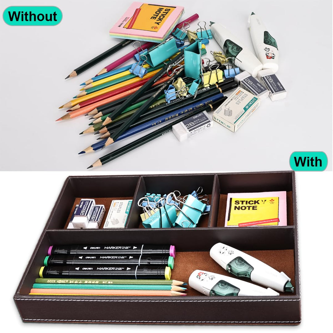 - Original Office Storage Supplies – Pu Leather Desk Organizer Tray, 4 Compartment Office Storage Supplies Stationery Drawer Tray, Nightstand Bedside Tray for Key, Wallet, Watch, Coin, Phone Valet Tray Stackable by KINGFOM