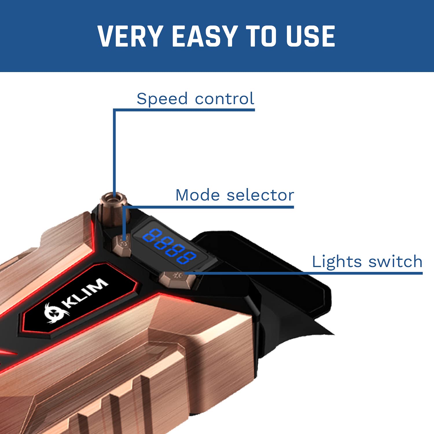 - EASY TO USE AND PORTABLE. With the buttons on the front, you can simply switch between modes, adjust the fan speed and view the speed on the display. The KLIM Cool+ laptop fan cooling pad is light and is small enough to fit in your palm.