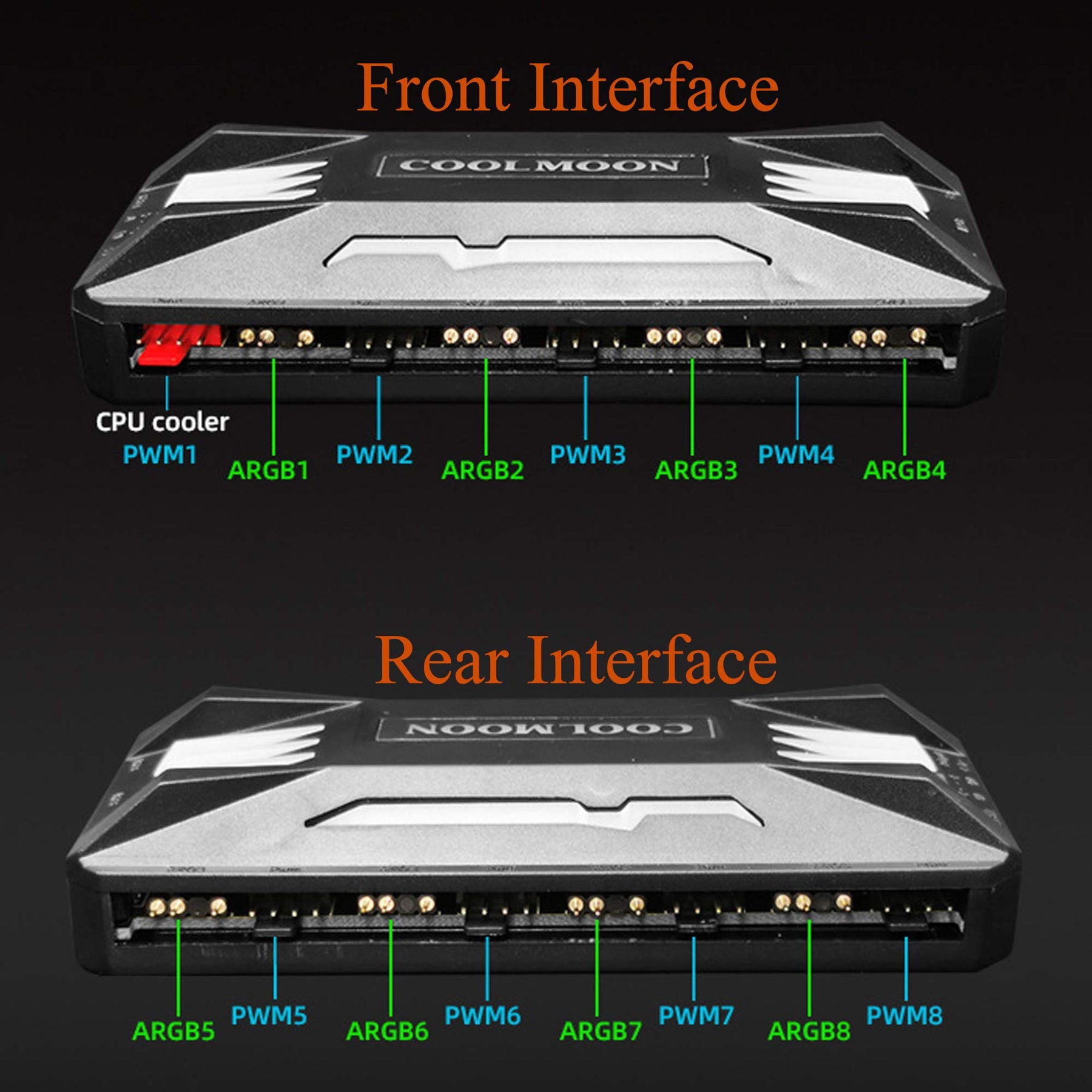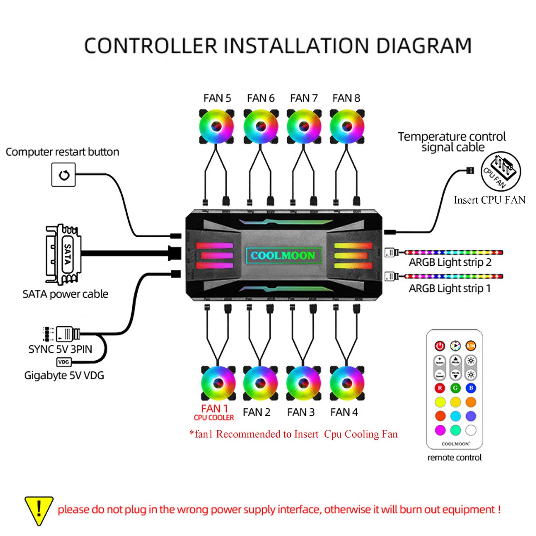 - Desktop Computer P-argb Fan Temperature Control Controller:direct SATA Power Input, support 8 PWM intelligent temperature control (4-pin) + 10 5V ARGB interface (3-pin) + remote wireless remote control three in one function, enables users to optimally expand cooling capability within the chassis