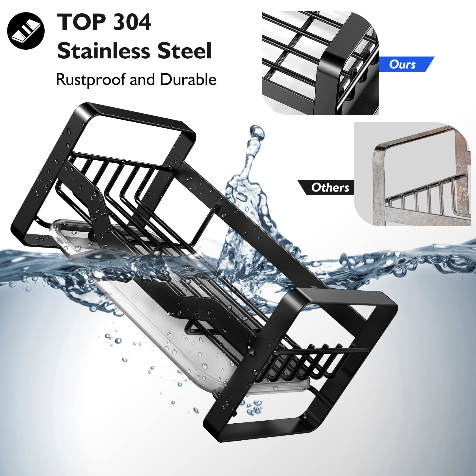 - Faster DryingThe kitchen sink organizer innovatively adopts a strip-shaped hole design, which increases the drainage speed compared with round holes, so that the surface of the sink brush holder can be quickly kept dry