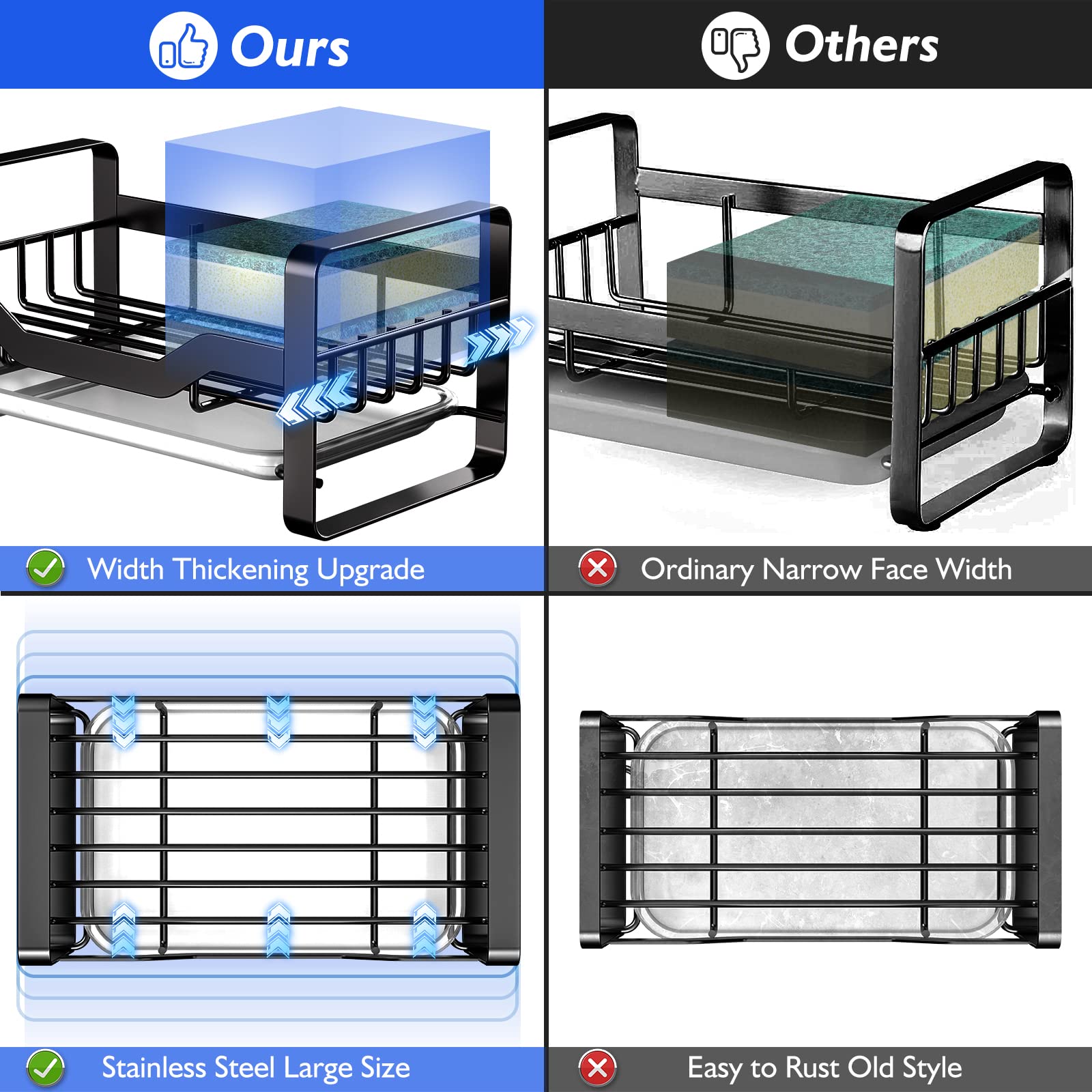 - Larger CapacityExtended to 4 inches in width and 7.15 inches in length. Compared with other kitchen sink sponge holder , the length and width are improved. Therefore, this sponge holder can bring more storage space and improve the storage capacity. The Kontoyo sponge holder is perfect for storing sponges,dish soap,soap dispenser,brushes. Keep your kitchen sink counter clean and tidy