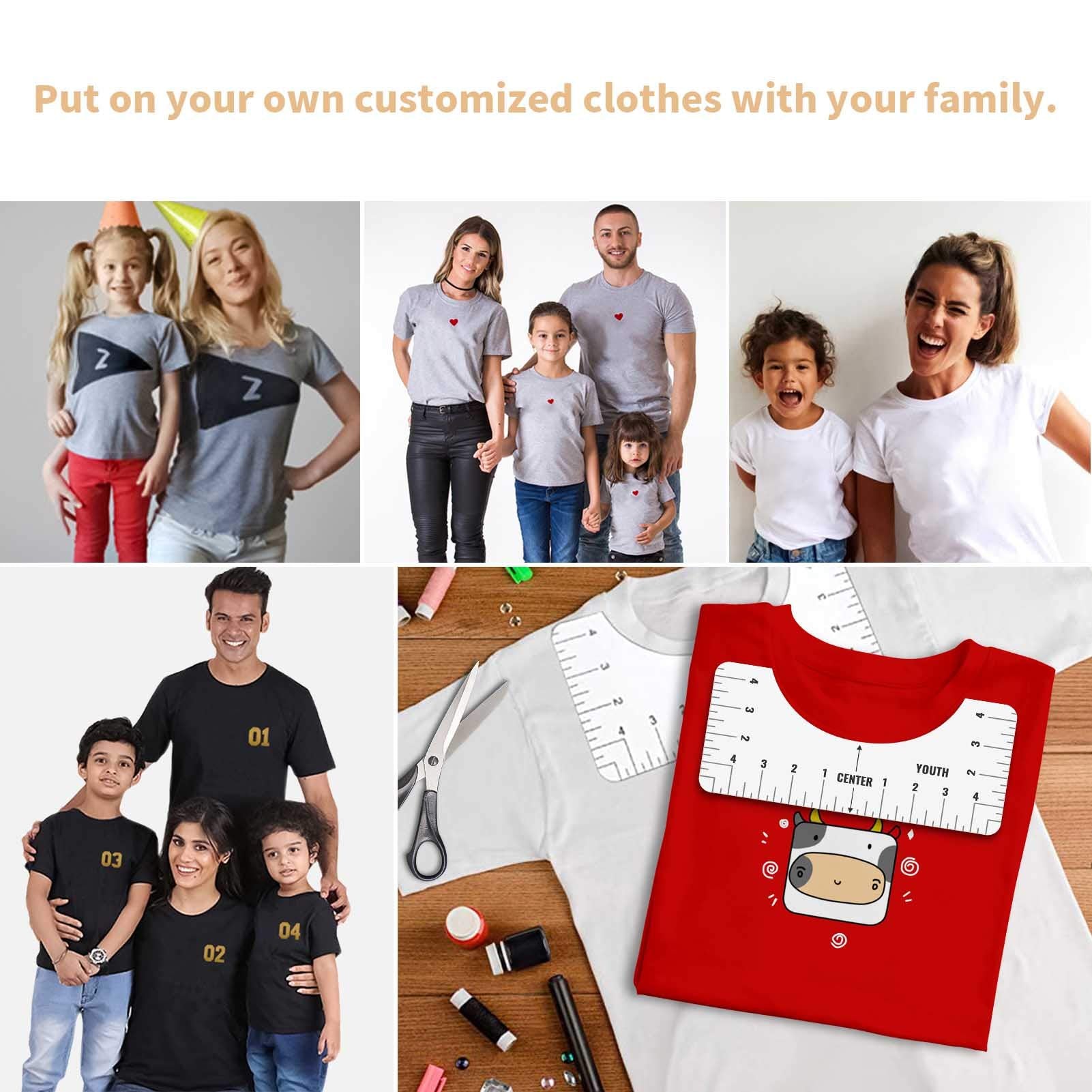 - Four Kinds RulerOur T-shirt alignment rulers have four different types of sizes:10*5in, 10x4.5in, 10x3.5in, 10x2.5in, including adult youth toddler infant, can meet different needs. Perfect for aligning your designs on multiple sized T-Shirts. The T-shirt ruler guide for vinyl is marked with clear numbers and marks, which are easy to read with any shirt color.