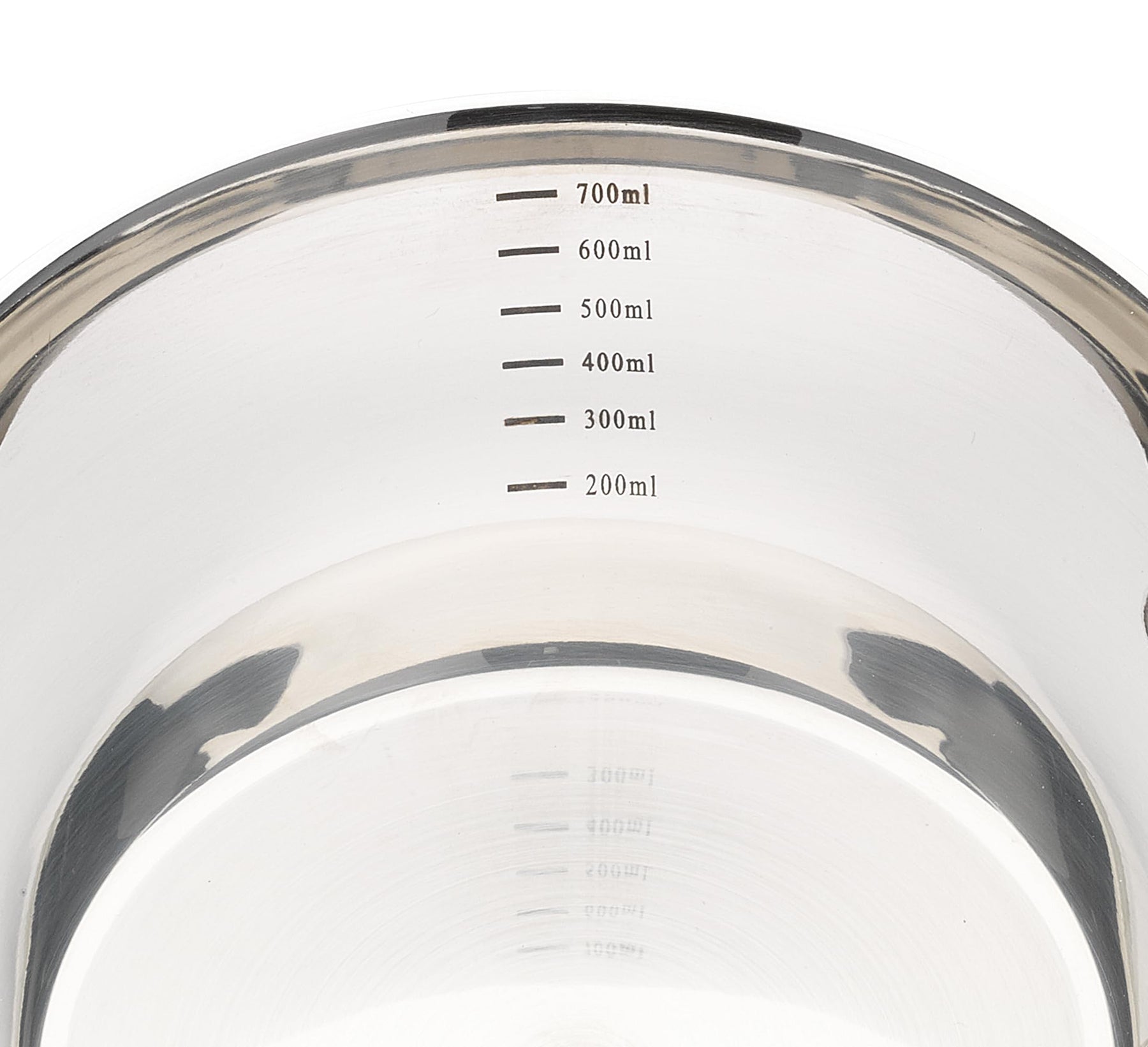 - STAINLESS SAUCEPAN: This saucepan is made of 100% 18/8 stainless steel and features 2 spouts for easy, carefree pouring. It is suitable for both left-handed and right-handed use. It has been designed to the highest quality standards with a clad bottom base and a welded handle. For further convenience and precision, there are graduated ml markings on the inside of the pot. This cooking pot has an approximately 5-inch diameter and a 0.5-quart capacity.