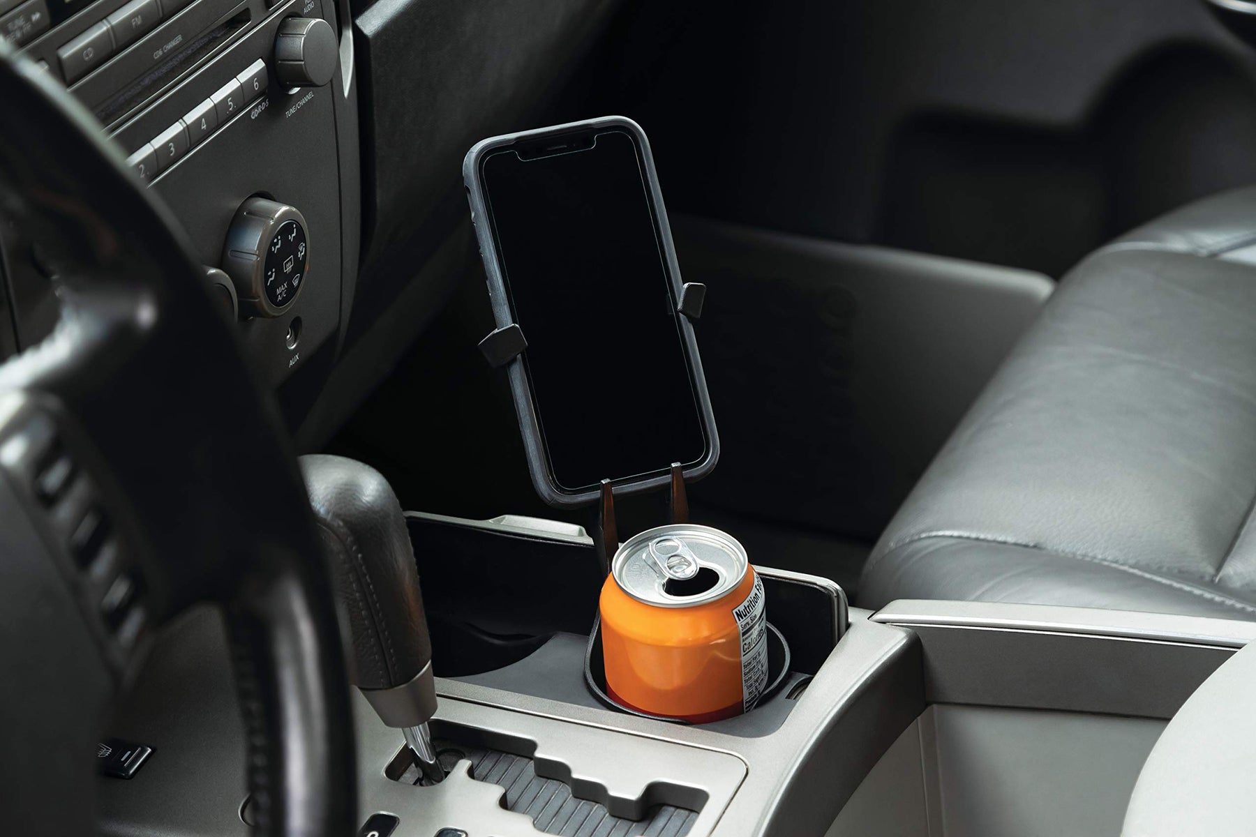 - Flexible arms secure most size phones/cases; Sized to fit standard travel cup sizes, water bottles, soda cans, etc.