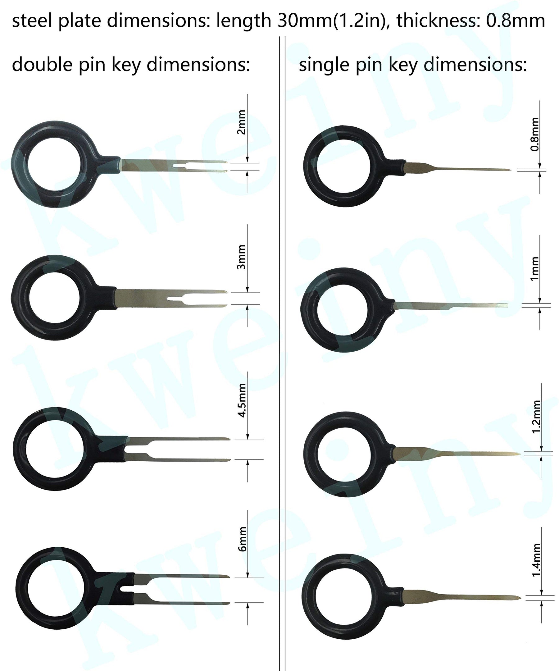 - Various specifications: This item include 18 pcs different types car plug terminal extraction repair tools. 6*Single Pin Extractor + 6*Double Pin Extractor + 6*Casing Tool, For detail size and quantity, please refer to the picture of the upper left corner.