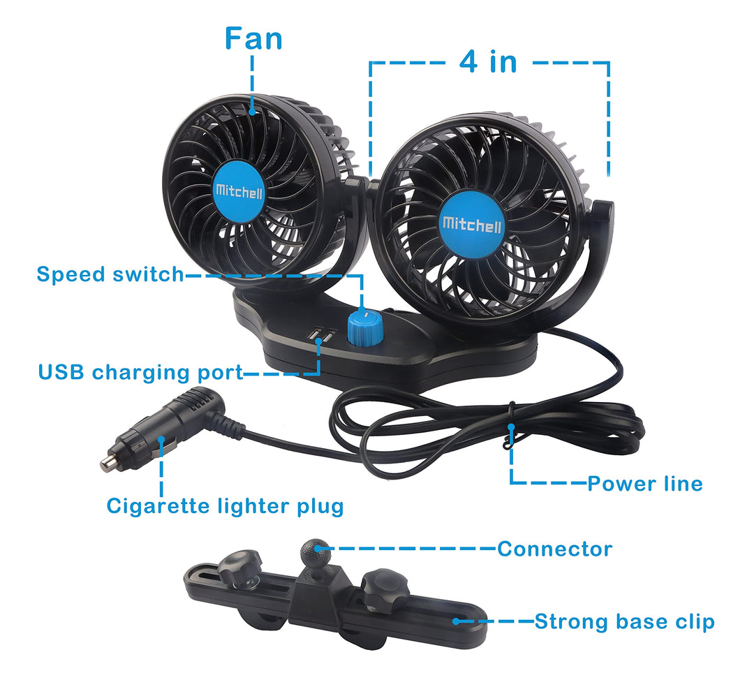 - Effective 12V Electric Car Fan: This 12v fan for car with 2 rotatable heads, that can be 360°rotate and adjust to whatever direction by manually. Cool down passengers and pets at back seat immediately with three part speed for choice when the car air conditioner is weak or no air conditioner at all. Everyone in your car will feel comfort and cool. Improve air quality staying fresh and keep cool in automotive vehicles. A car essentials on hot summer day.