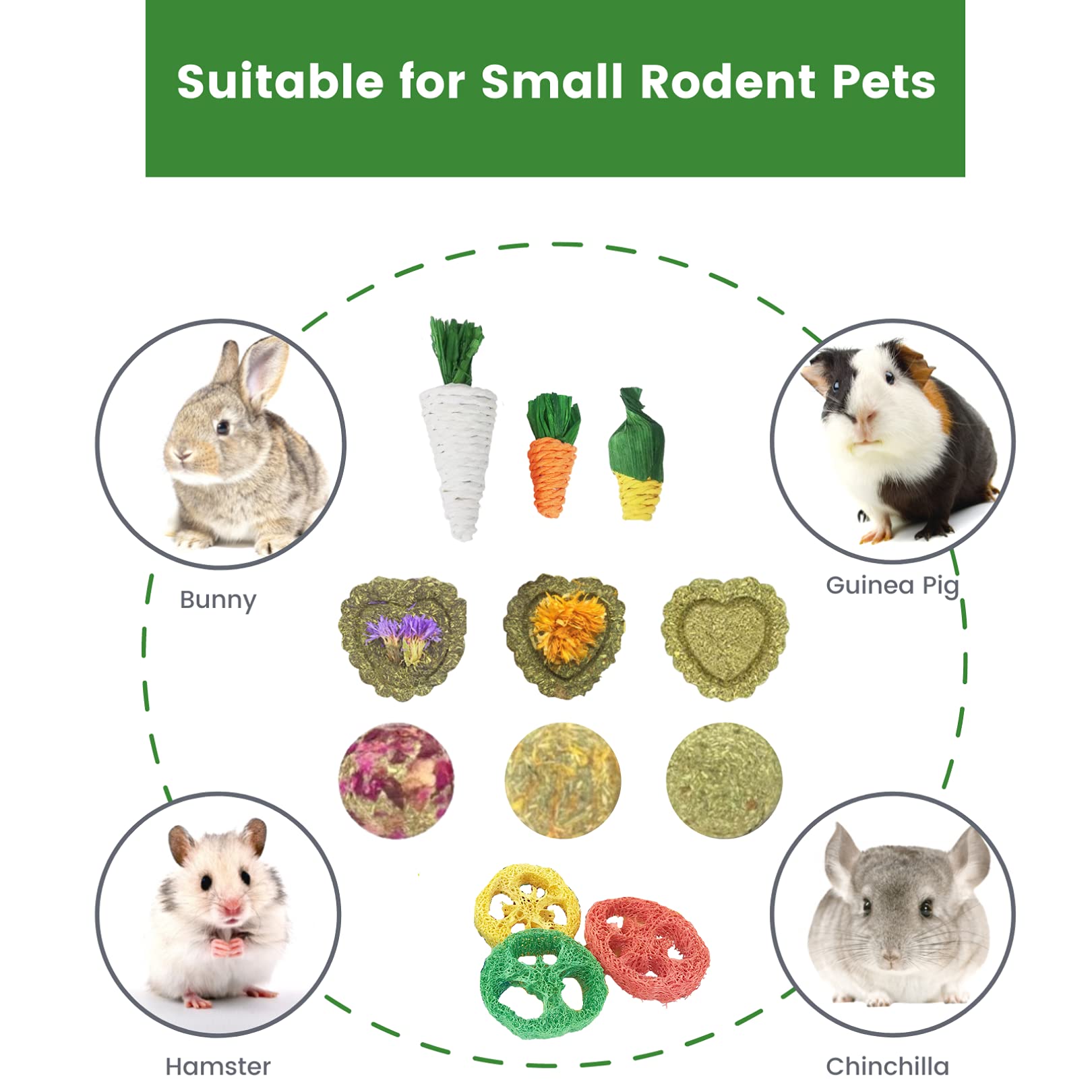 - Multi Function: Helps teeth and intestinal health, relieves intestinal inflammation. Other than tasty and great for small animals' teeth health, chewing treats and toys can keep your lovely pets stay active and relieves depression, stay happy