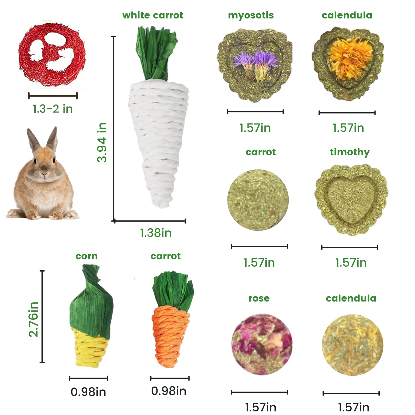 - 12 Pieces Great Deal of Value: Provide long lasting fun for your lovely pets. Packing list has 3 flavors grass balls, 3 flavors heart grass cakes, 3 loofah toys, 1 woven corn, 1 woven carrot, 1 woven white carrot