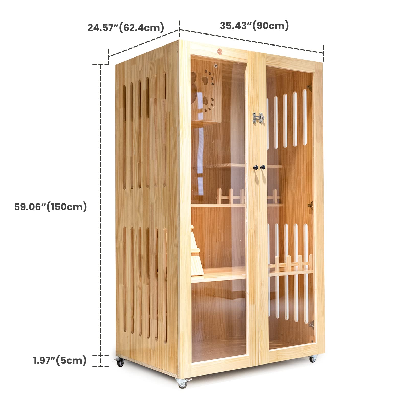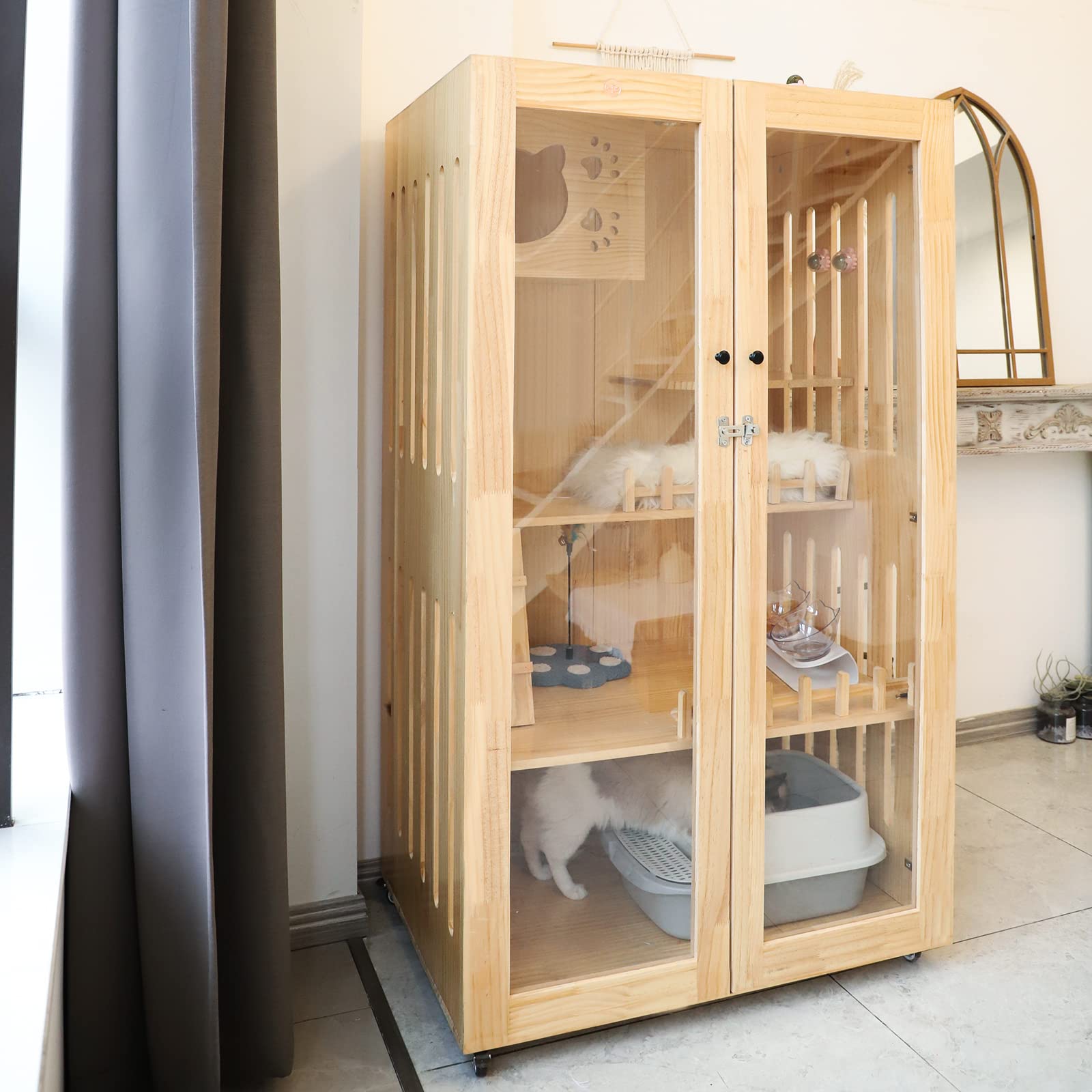 - Intimately designed house: The door of the cat villa is made of acrylic material, high-definition, transparent, allowing you to observe the cat;spacious space is comfortable and breathable, allowing your cat to move easily; built-in handle, latch and self-priming device, the bottom is equipped with four TPE silent universal wheels, you can moved and brake;
