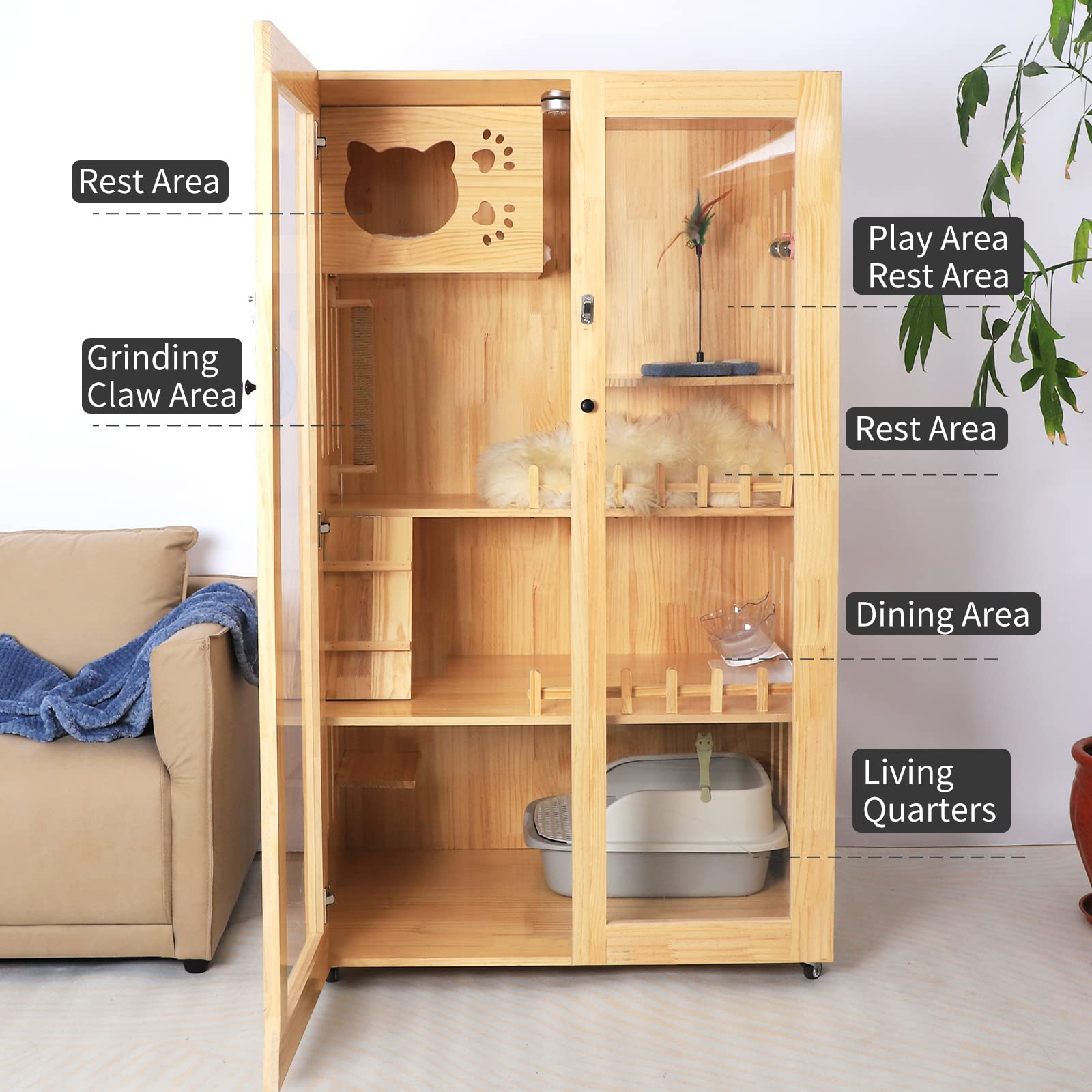 - Multifunctional cat house: The cat villa is divided into four areas: cat rest area; cat play area; cat dining area and toilet area; 59 inches x 35.4 inches x 27.6 inches cat villa is suitable for living 1-2 cats;
