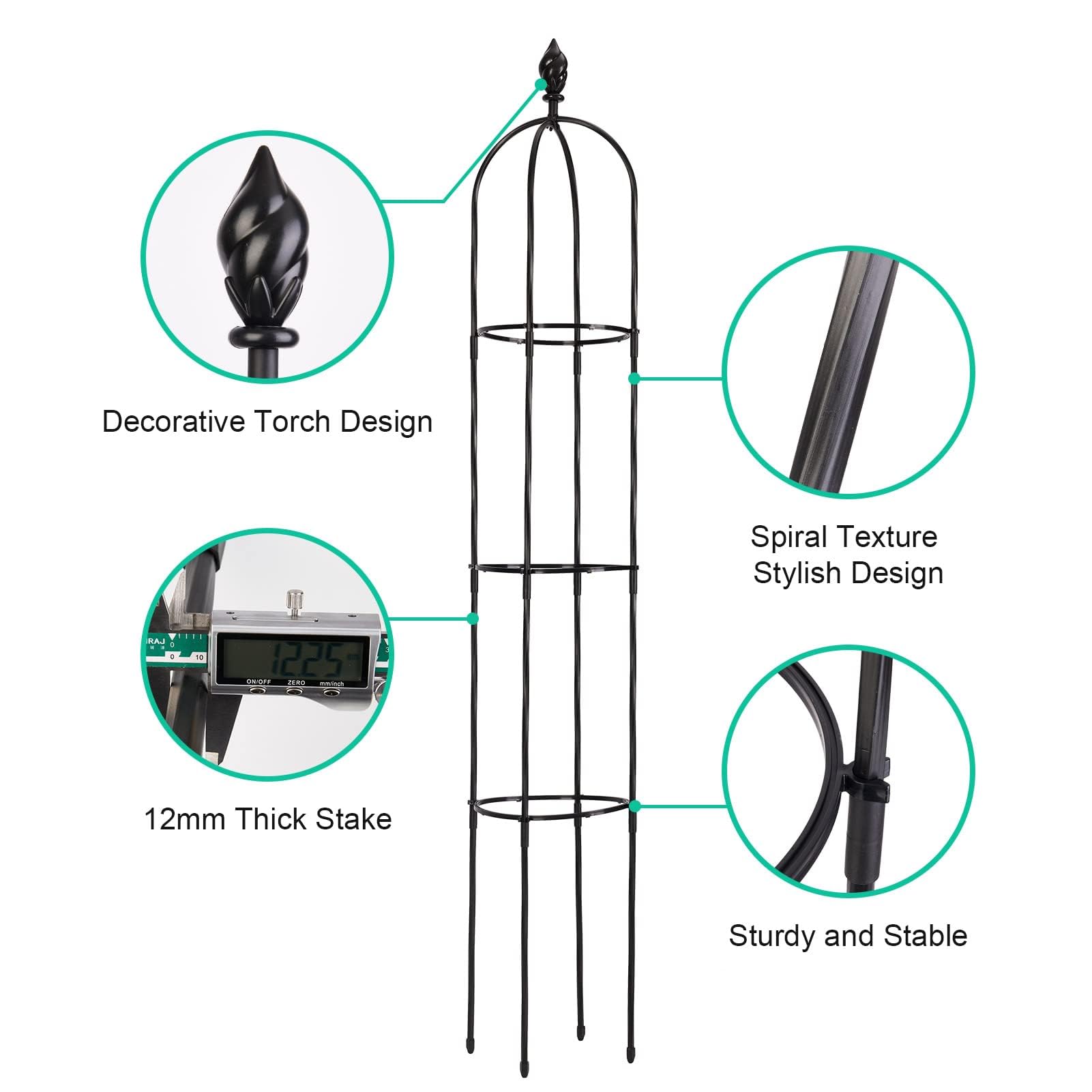 - Tall & Decorative - 1 pack, 6' Tall x 12 Wide garden obelisk trellis. They are great for training climbing plants and showcasing their beauty indoor outdoor.This plant cage can be adjusted based on different plant heights.The surface of the tube is spiral, and torch finial at the top. It’s just adds that extra decorative touch.