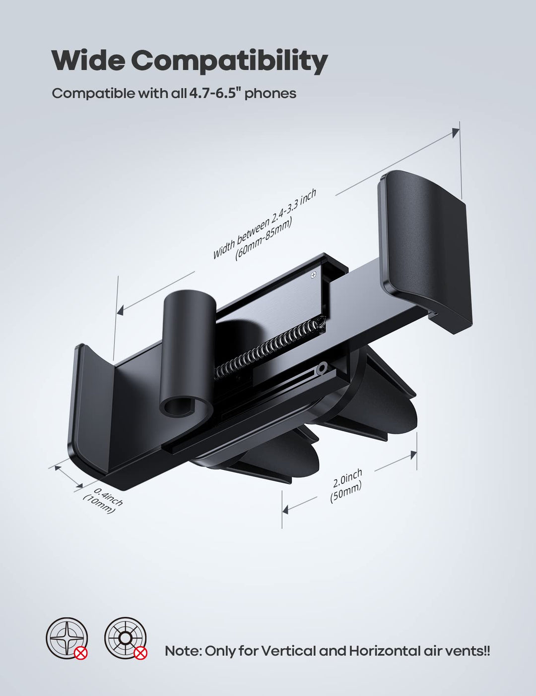 - Universal Compatibility: This vent phone holder fits all 4.7-6.7 inches mobile phones even with thick case cover, width size from 2.37” to 3.54”.