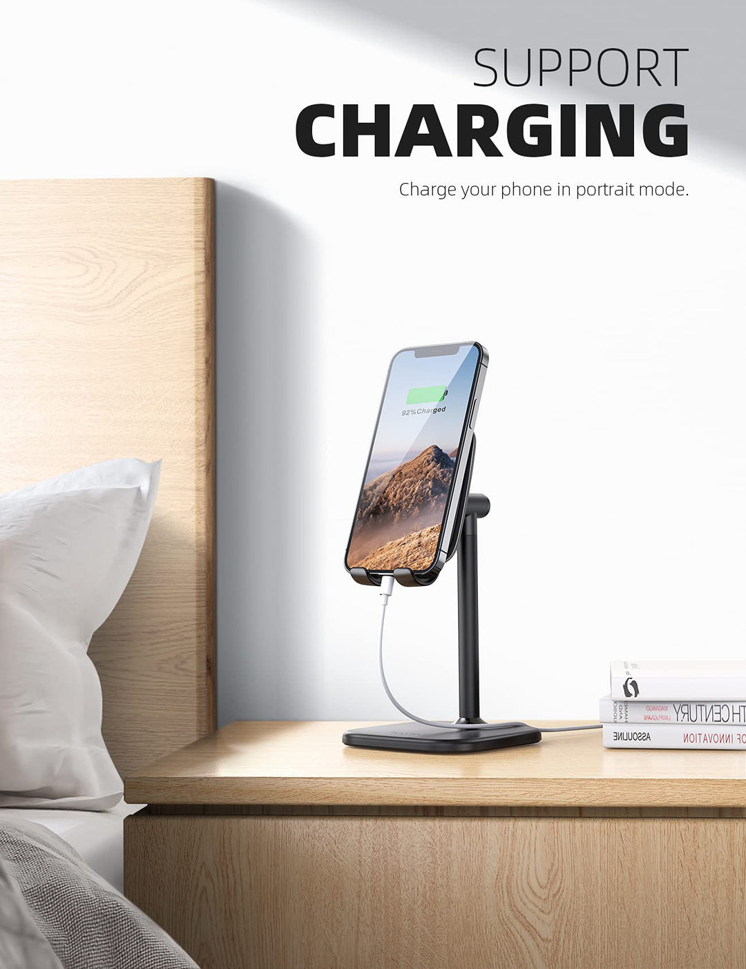 - Free your HandsThis adjustable phone stand is in accordance with ergonomic design. Design of flexible adjustable angle with comfortable height, reserved charging hole, allows you to find the best angle no matter you’re officing, facetiming, recording, watching videos, live, PC call, charging or cooking.