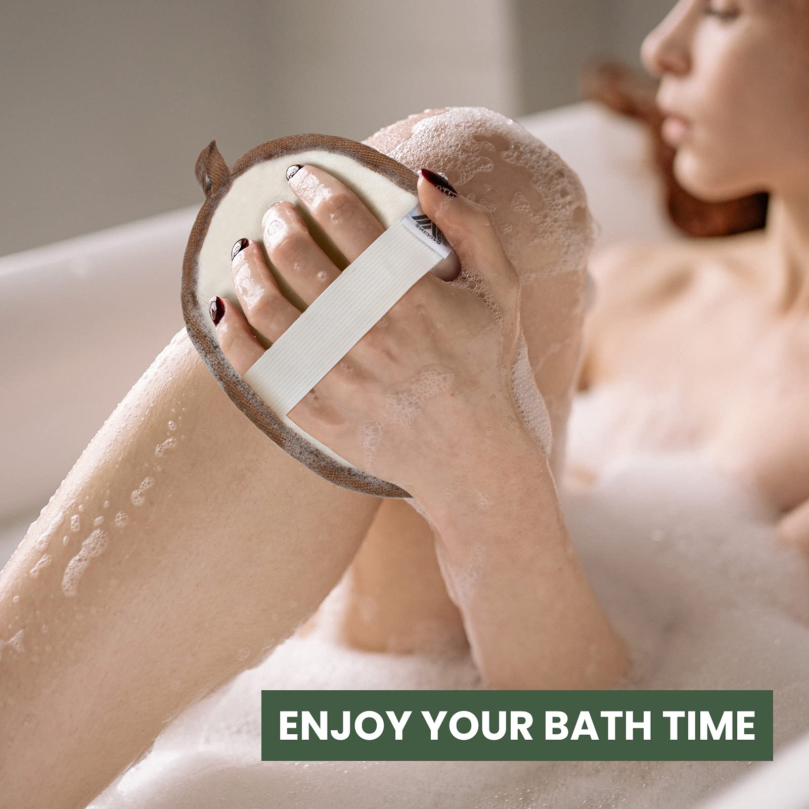 - BEST OPERABILITY: Exfoliating loofah body scrubber with elastic palm straps can slide and bend flexibly to the contours of your body.Hanging loop design on the top,the back has a soft terry cloth fabric,and the edges are sewn with cotton cloth,which is not easy to fall off.Intelligently sized to fit a variety of hands,Ideal loofah sponge for men and women of all body types.