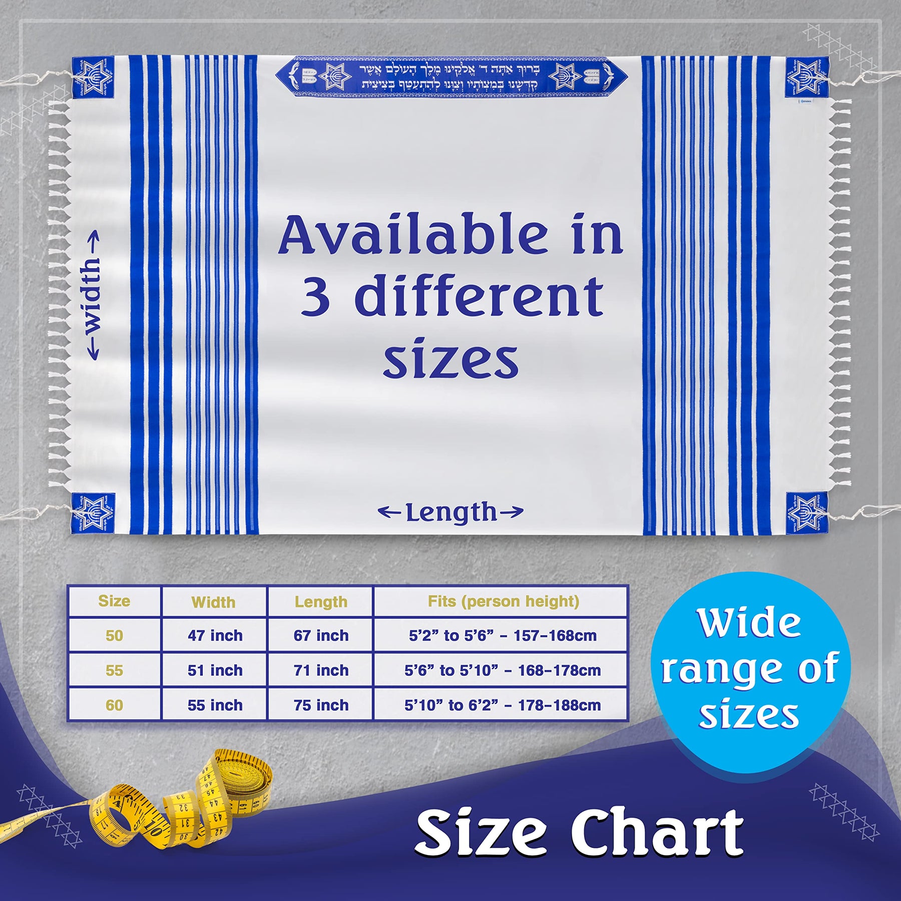- AVAILABLE IN 2 COLORS AND 3 SIZES: Our tallit is available in 3 full length sizes 47 x 67, 51 x 71, and 55 x 75. It also comes with 2 color options to complement any style: blue & silver and white & silver.