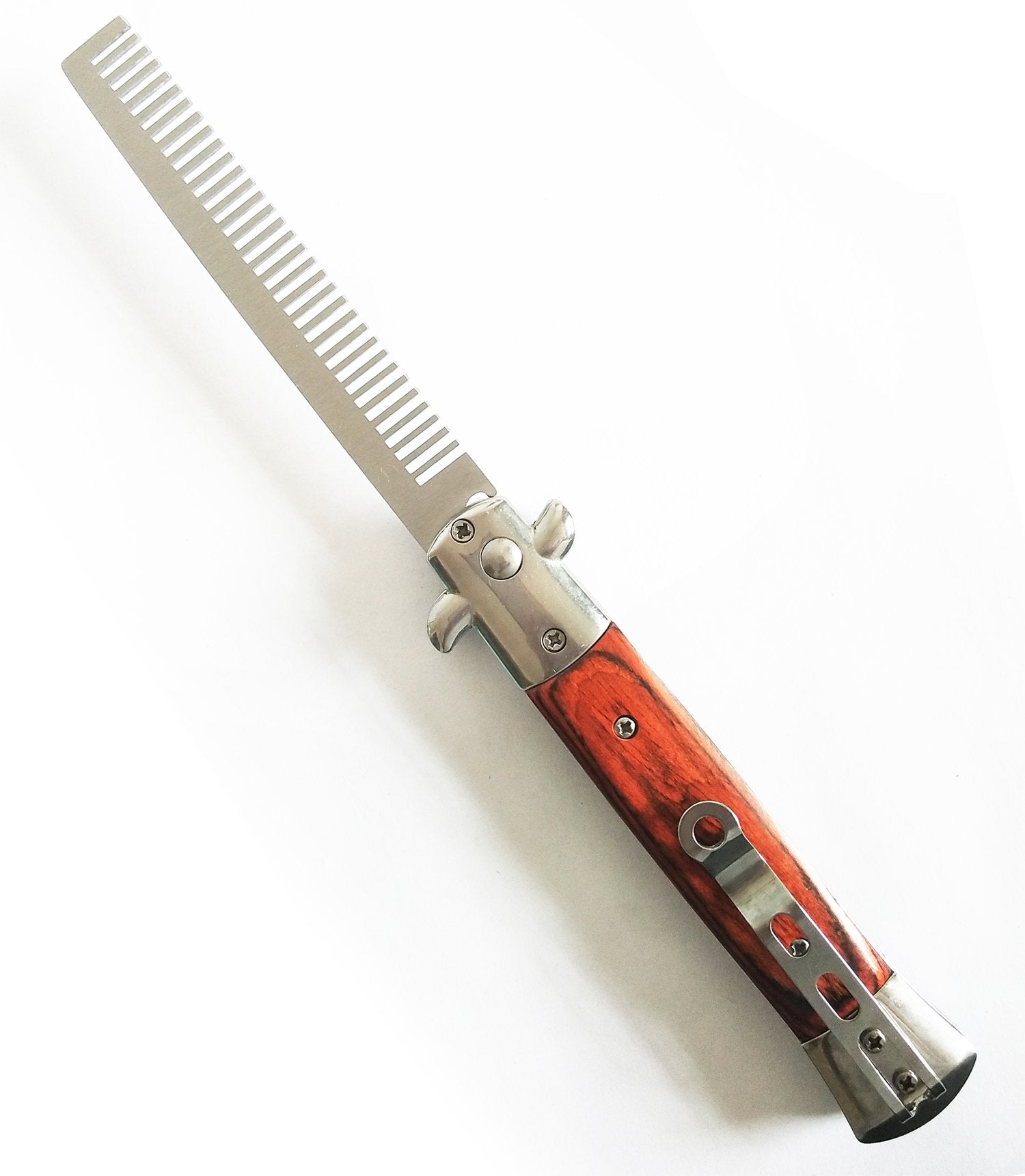 - BUTTON SWITCHBLADE COMB: The locking mechanism and durability will ensure the long life of your comb. Beware of cheaper combs on Amazon. Our enhanced spring mechanism and locking mechanism is built to last! The smooth shine of the polished handle and the overall classic design adds to the coolness factor.