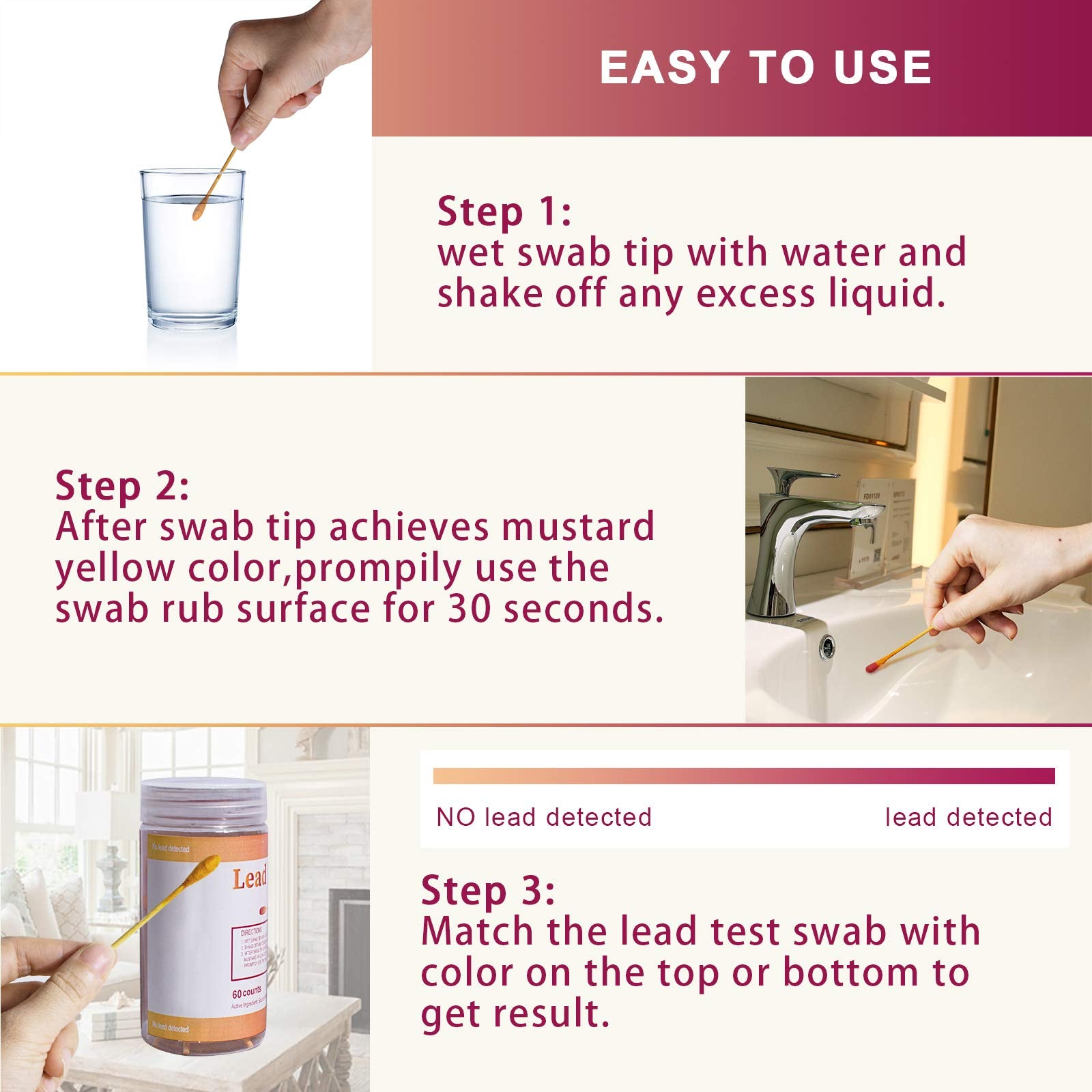 - EASY TO CHECK TEST RESULT: After rub painted surface, observe and match the lead test swabs with color on the top or bottom, if it is red/purple/pink, it means lead is present.