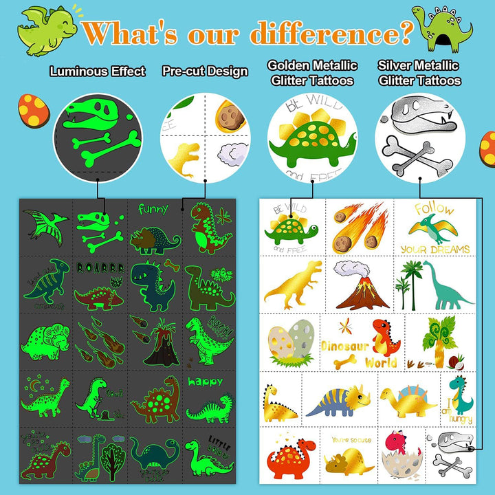 - Luminous + Metallic Glitter Dinosaur TattoosLeesgel dinosaur luminous+ metallic glitter tattoos. Totally 37 styles, the eye-catching Metallic Glitter and interesting Luminous tattoos will absolutely make your boys and girls be exceted!!! New combinations multi element design includes: tyrannosaurus Rex, pterosaur, spinosaur, dinosaur fossil, volcano and so on!