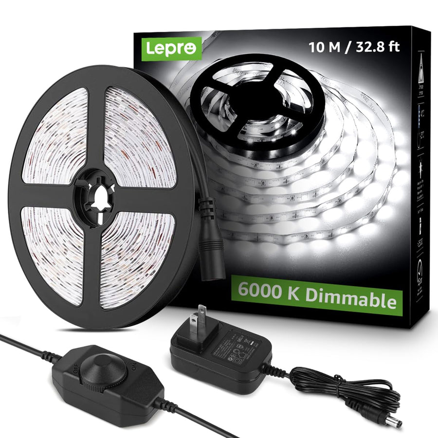 - Original LED Strip Lights – LED Strip Light, 32.8Ft Dimmable Vanity Lights, 6000K Super Bright LED Tape Lights, 420 LEDs SMD 2835, Strong 3M Adhesive, Suitable for Home, Kitchen, Under Cabinet, Bedroom, Daylight White by Lepro