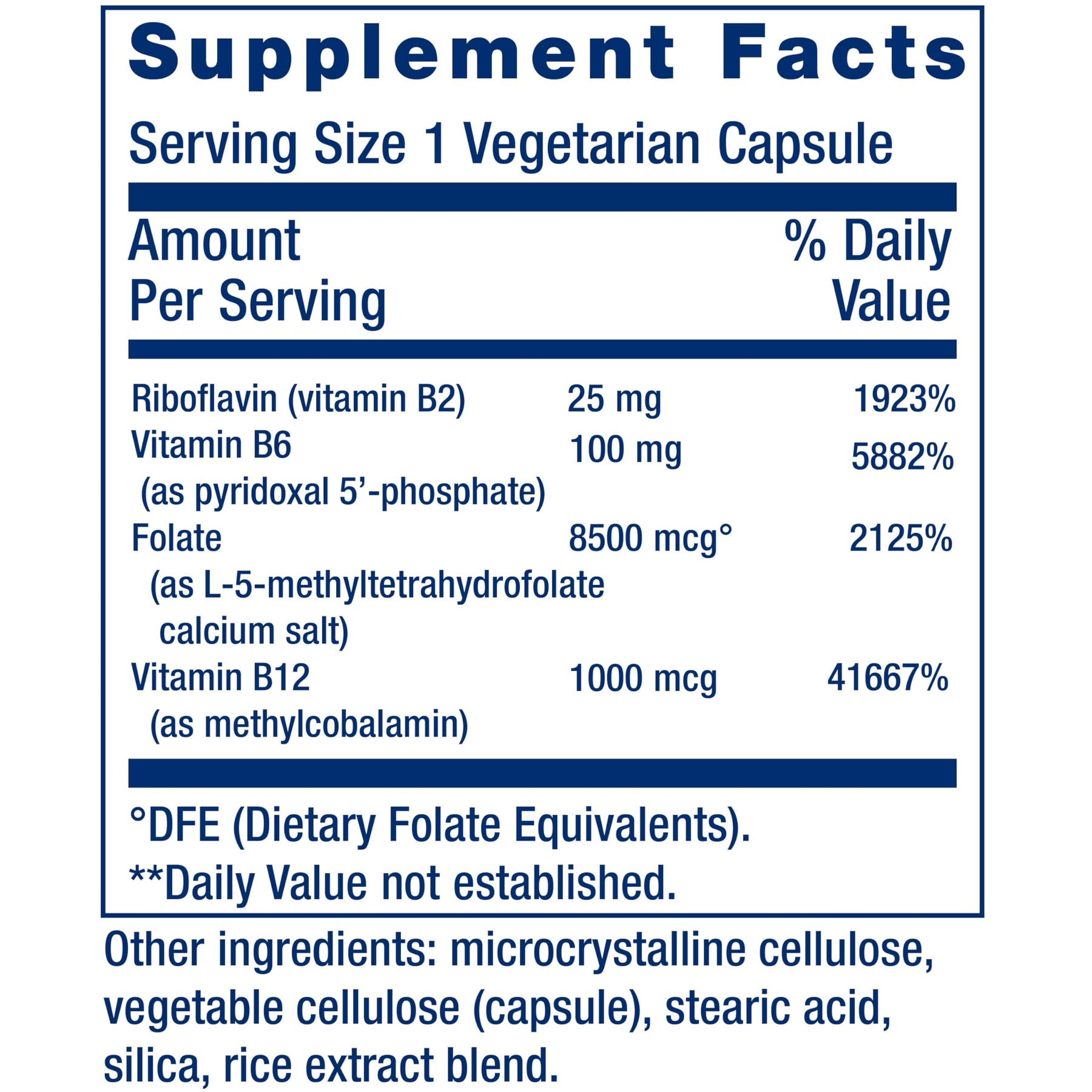 | ingredients | Riboflavin (vitamin B2) 25 mg 1471%Vitamin B6 (as pyridoxal 5’-phosphate) 100 mg 5000%Folate (as L-5-methyltetrahydrofolate 5000 mcg 1250% calcium salt)Vitamin B12 (as methylcobalamin) 1000 mcg 16667%Other ingredients: microcrystalline cellulose, vegetable cellulose (capsule), stearic acid, silica, rice extract blend. |