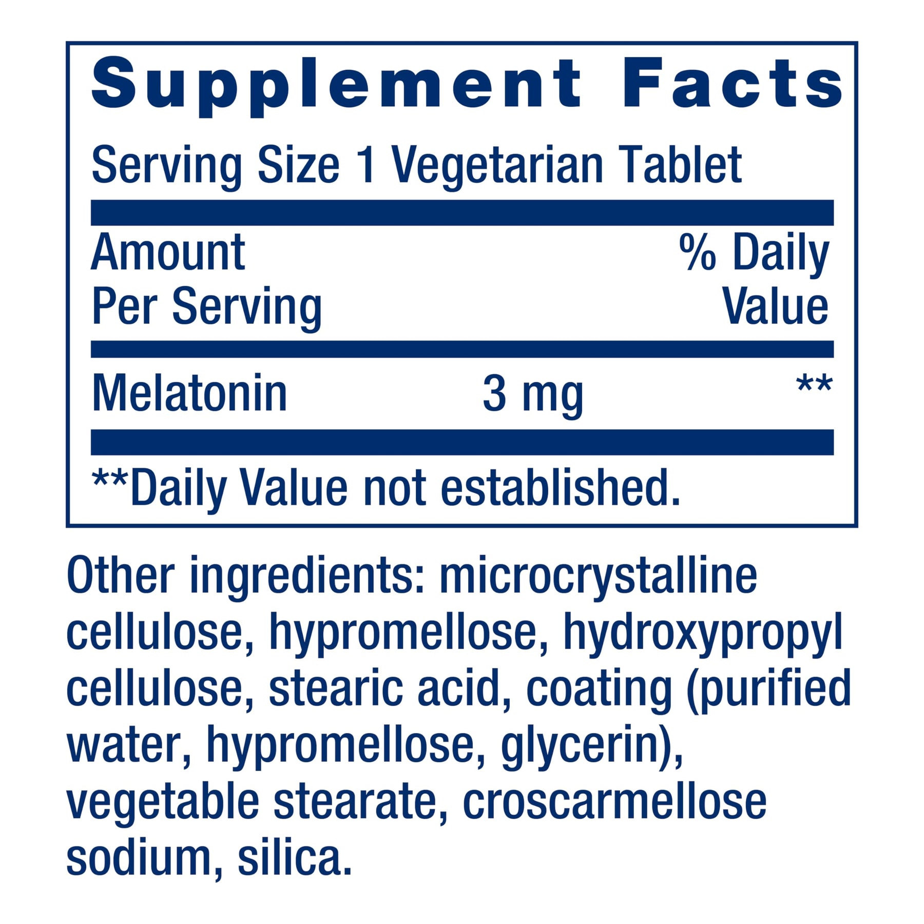 | ingredients | Melatonin 3 mg Other ingredients: microcrystalline cellulose, hypromellose, hydroxypropyl cellulose, stearic acid, coating (purified water, hypromellose, glycerin), vegetable stearate, croscarmellose sodium, silica. |