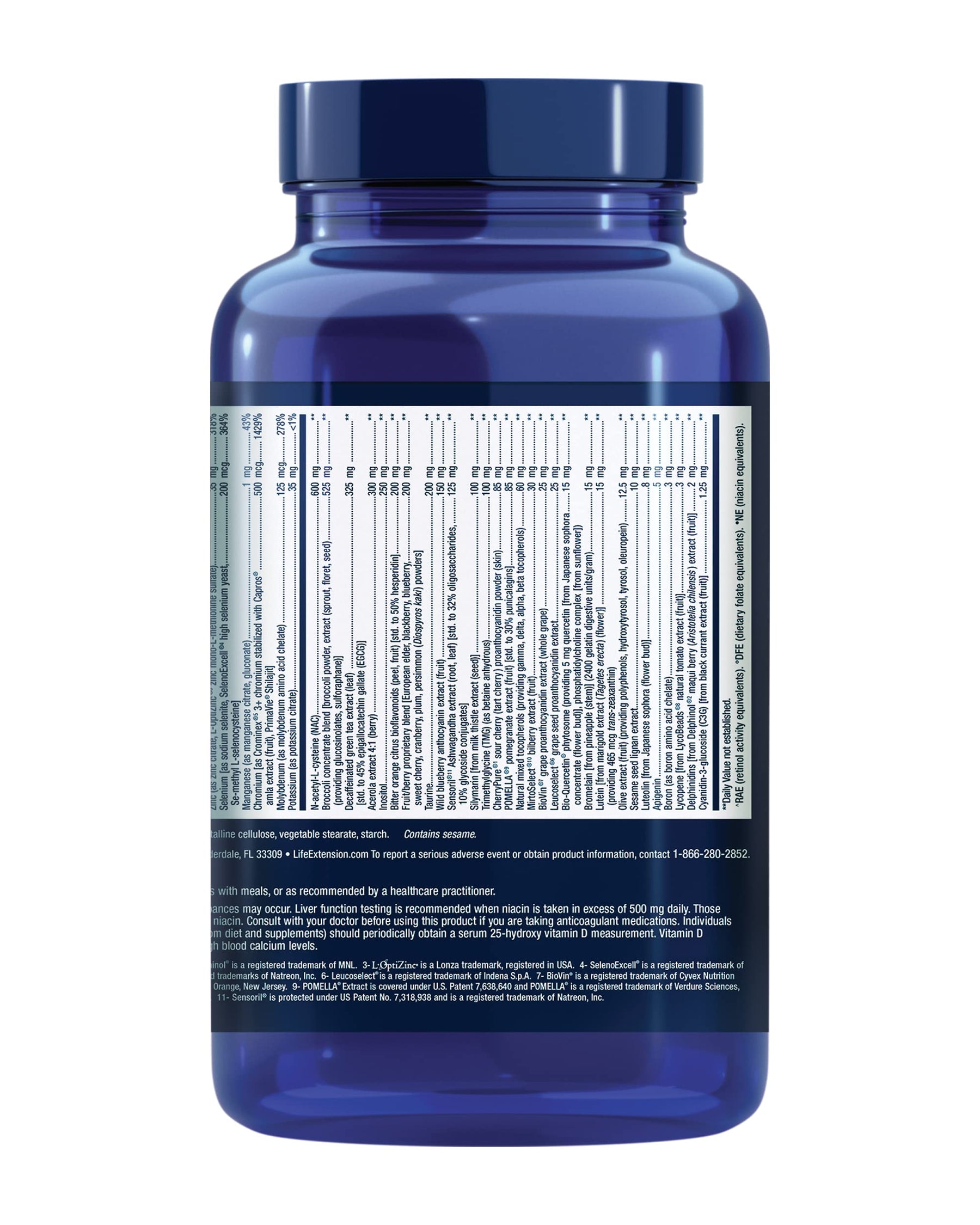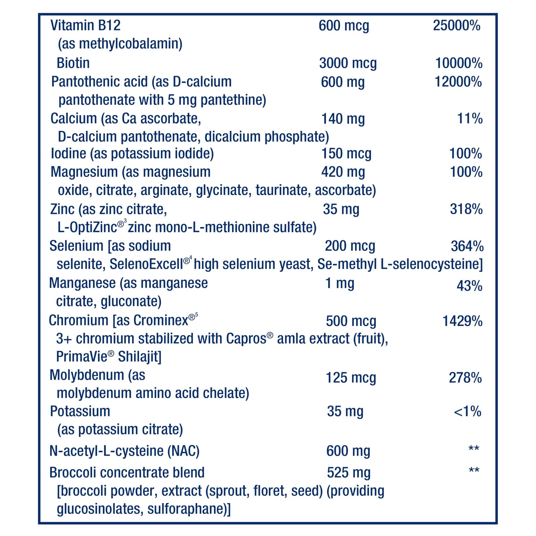 | ingredients | Vitamin A (as beta-carotene, acetate) (5,000 IU) 1500 mcg^ Vitamin C (as calcium ascorbate, ascorbic acid, ascorbyl palmitate, magnesium ascorbate, niacinamide ascorbate, acerola extract) 970 mg Vitamin D3 (as cholecalciferol) (2,000 IU) 50 mcg Vitamin E (as D-alpha tocopheryl succinate, D-alpha tocopherol) 67 mg Thiamine (vitamin B1) (as thiamine HCl) 125 mg Riboflavin (vitamin B2) (as riboflavin, riboflavin 5’-phosphate) 50 mg Niacin (as 61% niacinamide, 38% niacin, 1% niacinamide ascorbate) 190 mg• Vitamin B6 as pyridoxal 5’-phosphate (100 mg), pyridoxine HCI (5 mg) 105 mg Folate (as L-5-methyltetrahydrofolate calcium salt) 680 mcg° Vitamin B12 (as methylcobalamin) 600 mcg Biotin 3000 mcg Pantothenic acid (as D-calcium pantothenate with 5 mg pantethine) 600 mg Calcium (as Ca ascorbate, D-calcium pantothenate, dicalcium phosphate) 140 mg Iodine (as potassium iodide) 150 mcg Magnesium (as magnesium oxide, citrate, arginate, glycinate, taurinate, ascorbate) 420 mg Zinc (as zinc citrate, L-OptiZinc®3 zinc mono-L-methionine sulfate) 35 mg Selenium as sodium selenite, SelenoExcell®4 high selenium yeast, Se-methyl L-selenocysteine 200 mcg Manganese (as manganese citrate, gluconate) 1 mg Chromium as Crominex®5 3+ chromium stabilized with Capros® amla extract (fruit), PrimaVie® Shilajit 500 mcg Molybdenum (as molybdenum amino acid chelate) 125 mcg Potassium (as potassium citrate) 35 mg Broccoli concentrate blend broccoli powder, extract (sprout , floret, seed) (providing glucosinolates, sulforaphane) 525 mg N-acetyl-L-cysteine (NAC) 600 mg Decaffeinated green tea extract (leaf) std. to 45% epigallocatechin gallate (EGCG) 325 mg Acerola extract 4:1 (berry) 300 mg Inositol 250 mg Bitter orange citrus bioflavonoids (peel, fruit) std. to 50% hesperidin 200 mg Fruit/berry proprietary blend European elder, blackberry, blueberry, sweet cherry, cranberry, plum, persimmon (Diospyros kaki) powders 200 mg Taurine 200 mg Wild blueberry anthocyanin extract (fruit) 150 mg Sensoril®10 Ashwagandha extract (root, leaf) std. to 32% oligosaccharides, 10% glycoside conjugates 125 mg Silymarin from milk thistle extract (seed) 100 mg Trimethylglycine (TMG) (as betaine anhydrous) 100 mg CherryPure®1 sour cherry (tart cherry) proanthocyanidin extract (skin) 85 mg POMELLA®8 pomegranate extract (fruit) std. to 30% punicalagins 85 mg Natural mixed tocopherols (providing gamma, delta, alpha, beta tocopherols) 60 mg MirtoSelect®9 bilberry extract (fruit) 30 mg Leucoselect®6 grape seed proanthocyanidin extract 25 mg Bio-Quercetin® Proprietary Blend providing 35% quercetin (5 mg) from Japanese sophora concentrate (flower bud), 30% galactomannans (4 mg) from fenugreek (seed) 14 mg Bromelain from pineapple (stem) (2400 gelatin digestive units/gram) 15 mg Lutein from marigold extract (Tagetes erecta) (flower) (providing 465 mcg trans-zeaxanthin) 15 mg Olive extract (fruit) (providing polyphenols, hydroxytyrosol, tyrosol, oleuropein) 12.5 mg Sesame seed lignan extract 10 mg Luteolin from Japanese sophora (flower buds) 8 mg Apigenin 5 mg Boron (as boron amino acid chelate) 3 mg Lycopene from LycoBeads®7 natural tomato extract (fruit) 3 mg Delphinidins from Delphinol®2 maqui berry (Aristotelia chilensis) extract (fruit) 2 mg Cyanidin-3-glucoside (C3G) from black currant extract (fruit) 1.25 mg Other ingredients: gelatin (capsule), maltodextrin, silica, microcrystalline cellulose, vegetable stearate, starch, sunflower lecithin, sunflower oil. |