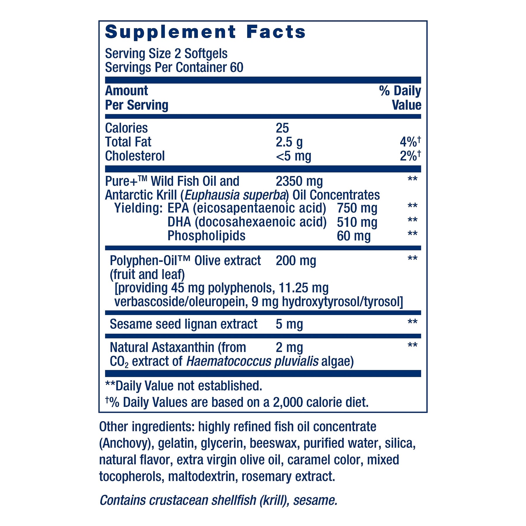 | ingredients | Calories 25 Total Fat 2.5 g Cholesterol < 5 mg Pure+™ Wild Fish Oil and Antarctic Krill (Euphausia superba) Oil Concentrates 2350 mg Yielding: EPA (eicosapentaenoic acid) 750 mg DHA (docosahexaenoic acid) 510 mg Phospholipids 60 mg Polyphen-Oil™ Olive extract (fruit and leaf) providing 45 mg polyphenols, 11.25 mg verbascoside/oleuropein, 9 mg hydroxytyrosol/tyrosol 200 mg Sesame seed lignan extract 5 mg Natural Astaxanthin (from CO2 extract of Haematococcus pluvialis algae) 2 mg Other ingredients: highly refined fish oil concentrate (from one or more anchovy, jack mackerel, mackerel, sardine), gelatin, glycerin, beeswax, purified water, silica, natural flavor, extra virgin olive oil, caramel color, maltodextrin, mixed tocopherols, rosemary extract. Contains crustacean shellfish (krill), sesame. Non-GMO |
