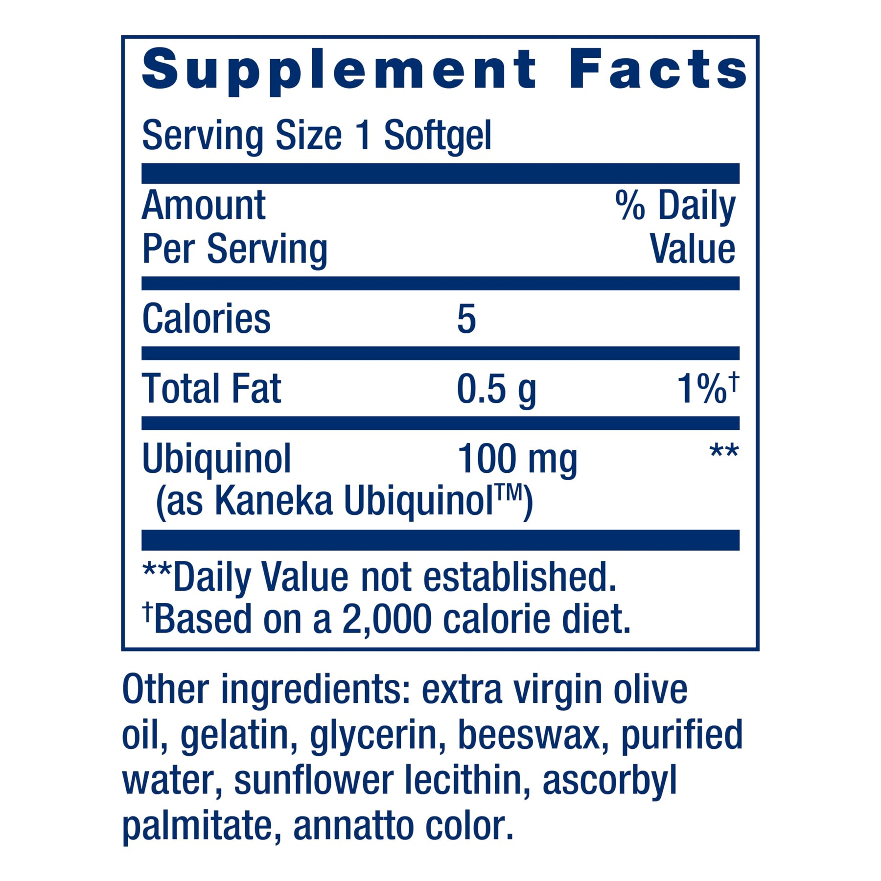 | ingredients | Ubiquinol (as Kaneka Ubiquinol™) 100 mg Other ingredients: extra virgin olive oil, gelatin, glycerin, beeswax, purified water, sunflower lecithin, ascorbyl palmitate, annatto color. Non-GMO Q+®, Kaneka Ubiquinol™, and the quality seal™ are registered or pending trademarks of Kaneka Corp. |