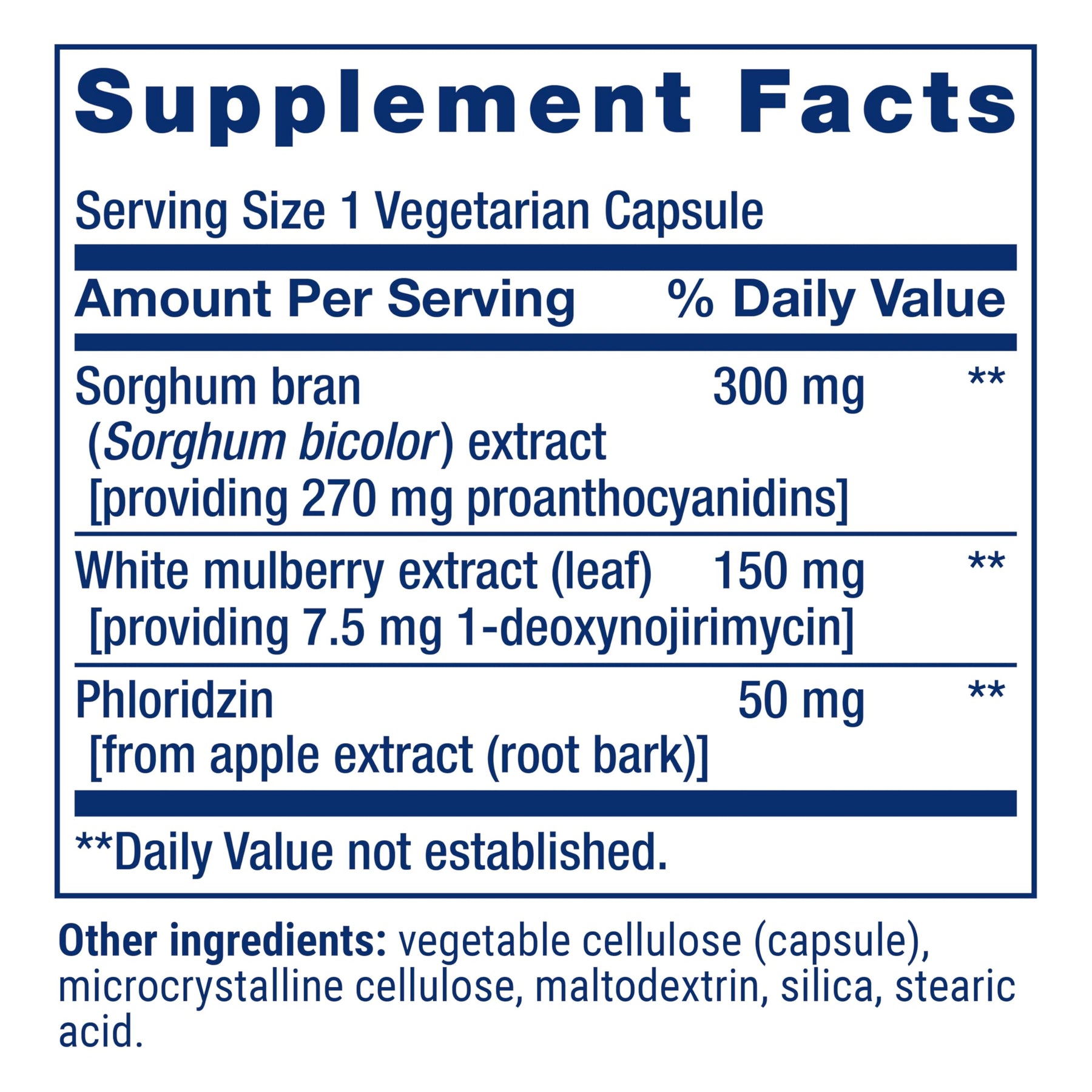 | ingredients | Sorghum bran (Sorghum bicolor) extract providing 270 mg proanthocyanidins 300mg, White mulberry extract (leaf) providing 7.5 mg 1-deoxynojirimycin 150mg, Phloridzin from apple extract (root bark) 50mg, Other ingredients: vegetable cellulose (capsule), microcrystalline cellulose, maltodextrin, silica, stearic acid |