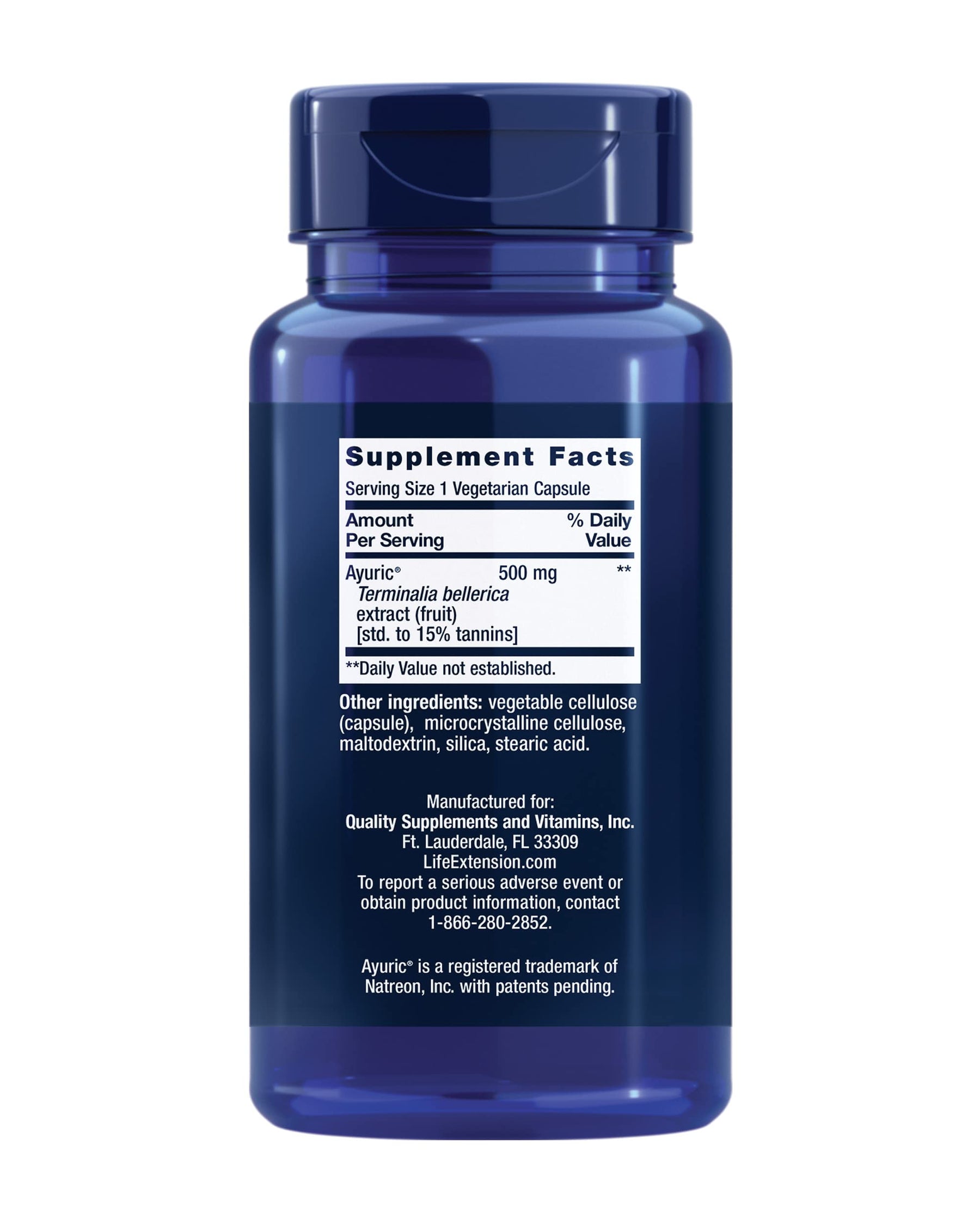 | ingredients | Ayuric® Terminalia bellerica extract (fruit) std. to 15% tannins 500 mg Other ingredients: vegetable cellulose (capsules), microcrystalline cellulose, maltodextrin, silica, stearic acid. |