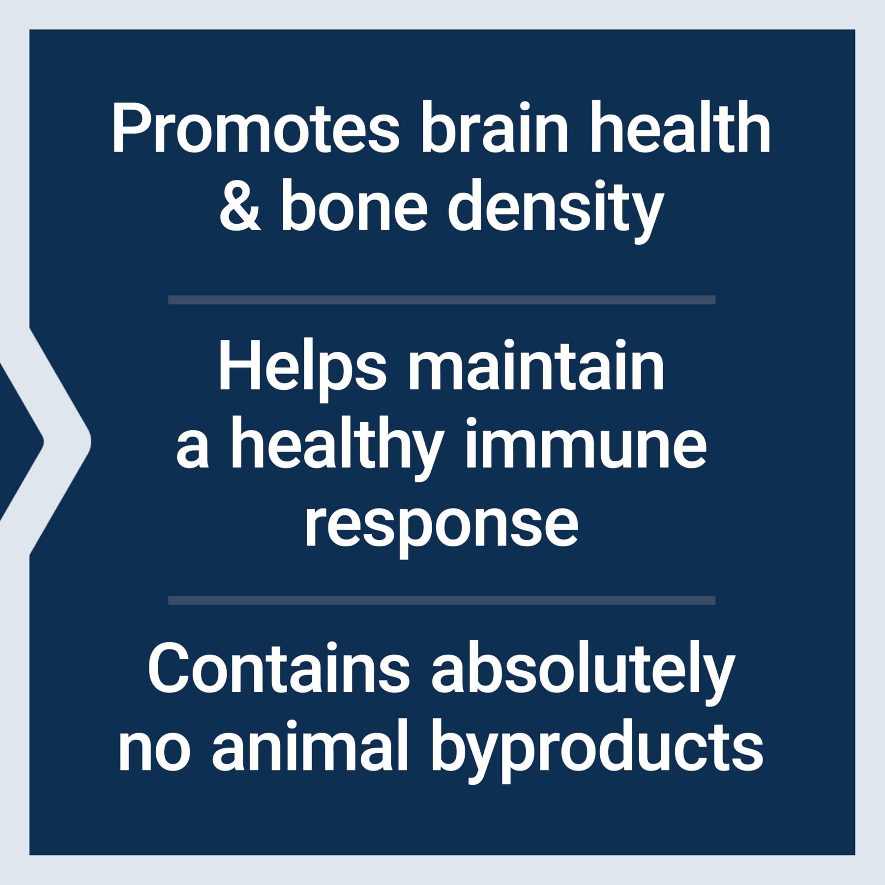 | product benefit | Promotes cognitive health & healthy bone density, Helps maintain a healthy immune response, Contains absolutely no animal by-products |