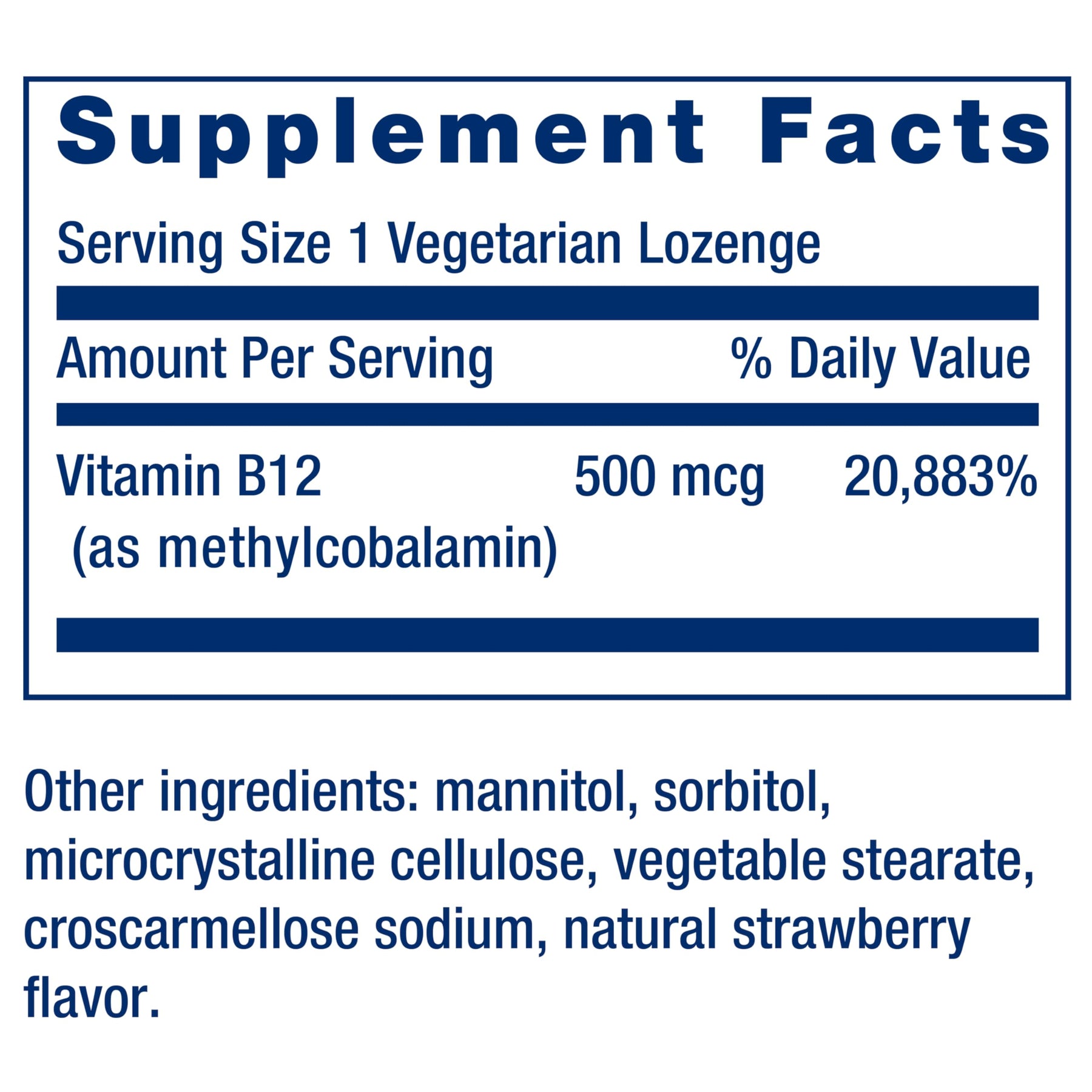 | ingredients | Vitamin B12 (as cyanocobalamin) Amt Per Serving:500 mcg % Daily Value :8,333%,,Other Ingredients: Mannitol, sorbitol, microcrystalline, cellulose, vegetable stearate, croscarmellose sodium, natural strawberry flavor. |
