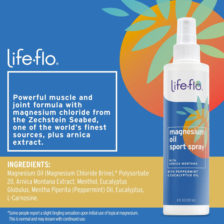| flavor | Life-flo Magnesium Oil Sport Spray, with Magnesium Chloride from The Zechstein Seabed Plus Arnica, Calms and Refreshes Muscles and Joints After Exercise, 60-Day Guarantee, Not Tested on Animals, 8oz |