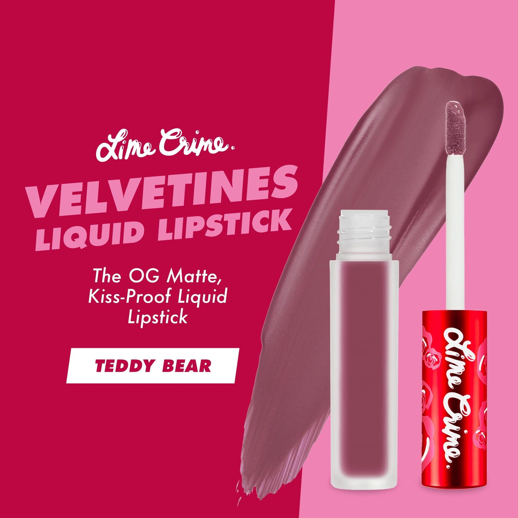 - Teddy Bear Velvetines Liquid Matte Lipstick: Inspired by our founder’s favorite flower, a red rose, the formula in Lime Crimes Velvetines Liquid Lipsticks easily glides on your lips and dries down to a soft matte finish with a creamy velvety texture – like a rose petal. Teddy Bear will bolden your makeup look with a lilac brown pout.