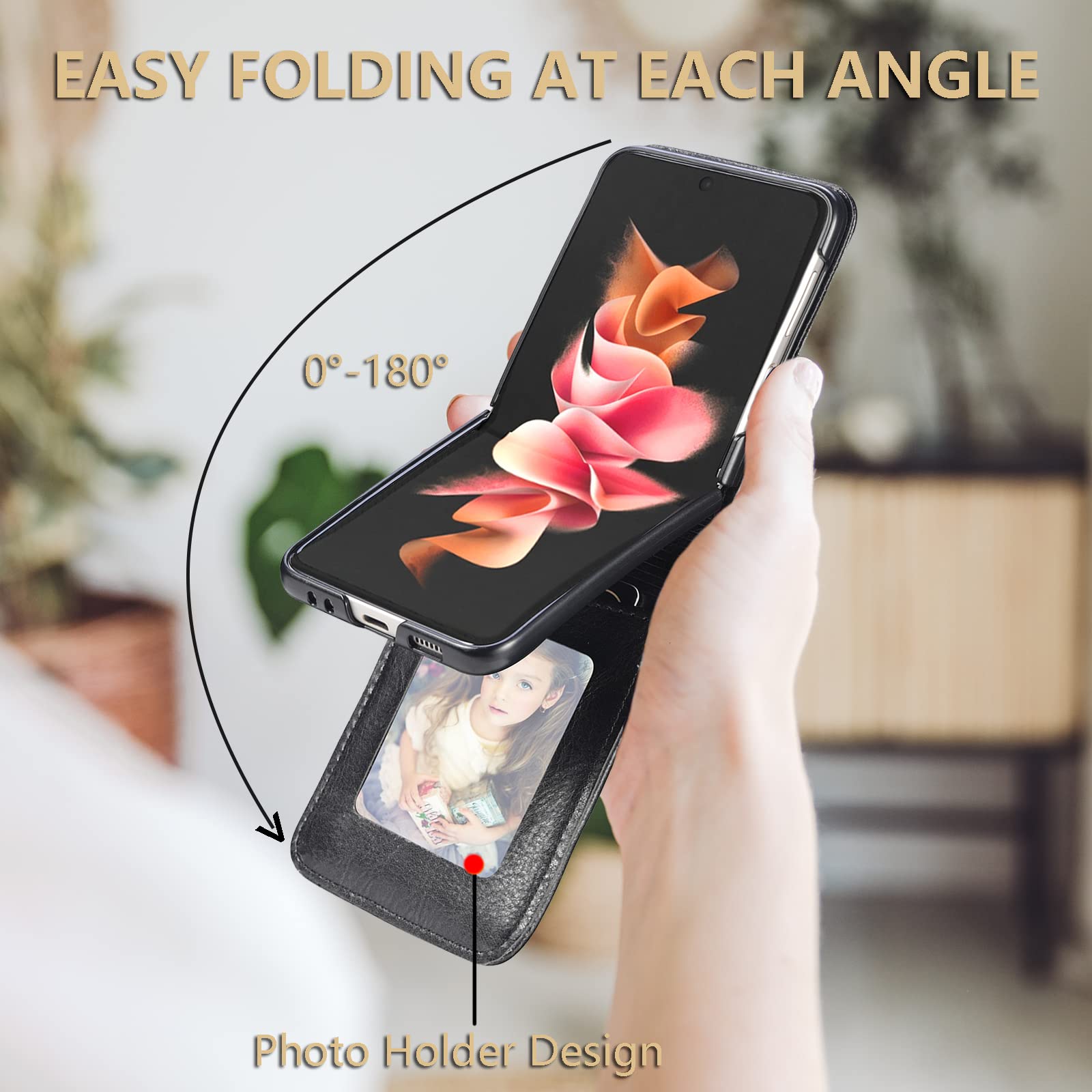 - SAY BYE BYE TO YOUR WALLET: The Samsung Galaxy Z Flip 3 wallet case offers Three credit card hoder outside and one photo holder inside. That will meet your daily life, such as credit card payment, some change, key storage, so say goodbye to your old wallet,