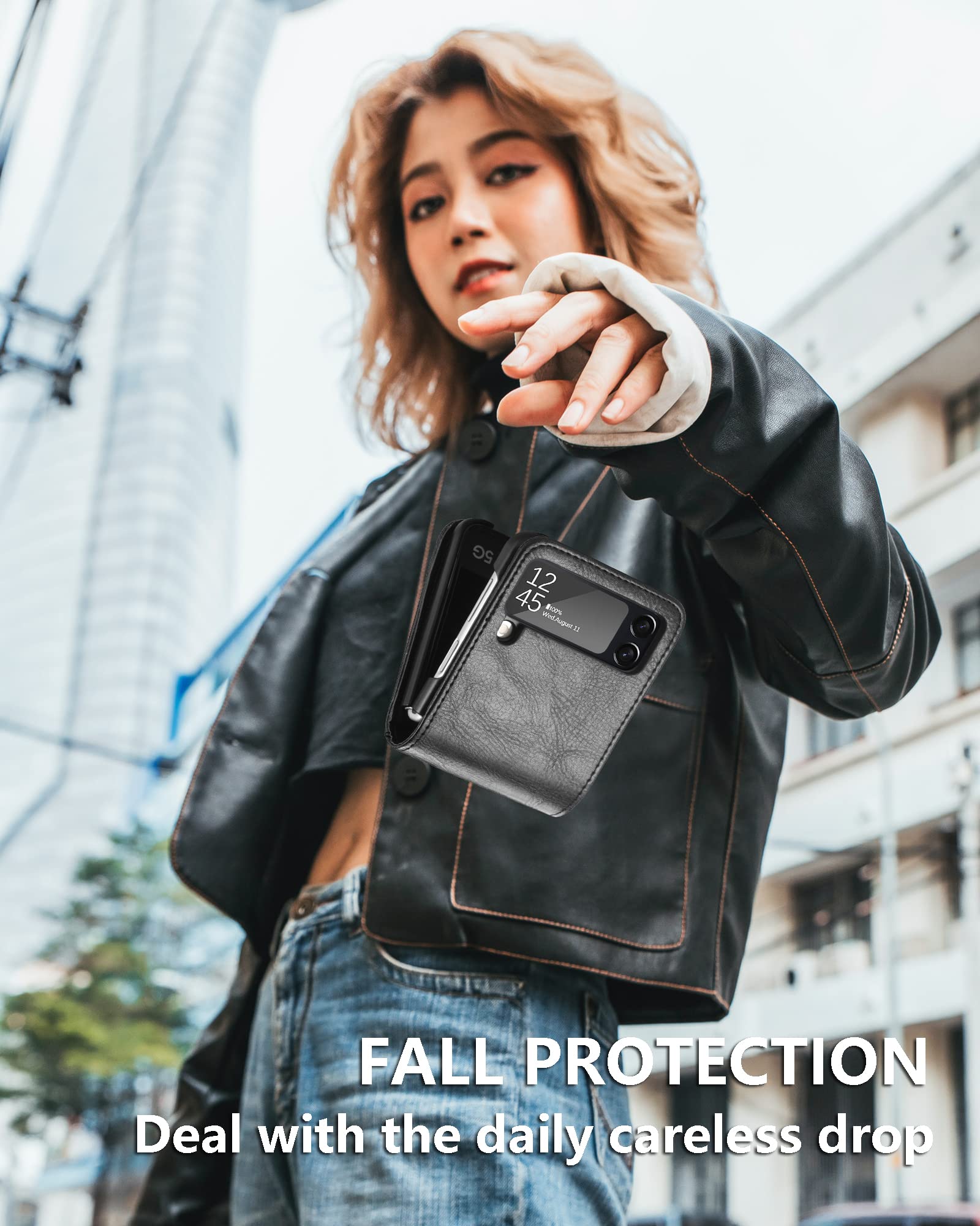 - NO WARRY FALLING: The Galaxy Z Flip 3 card holder case is made of high-strength hard PC shell and high-grade PU leather, Protect the phone screen and camera lens, No longer worry about daily careless falls.