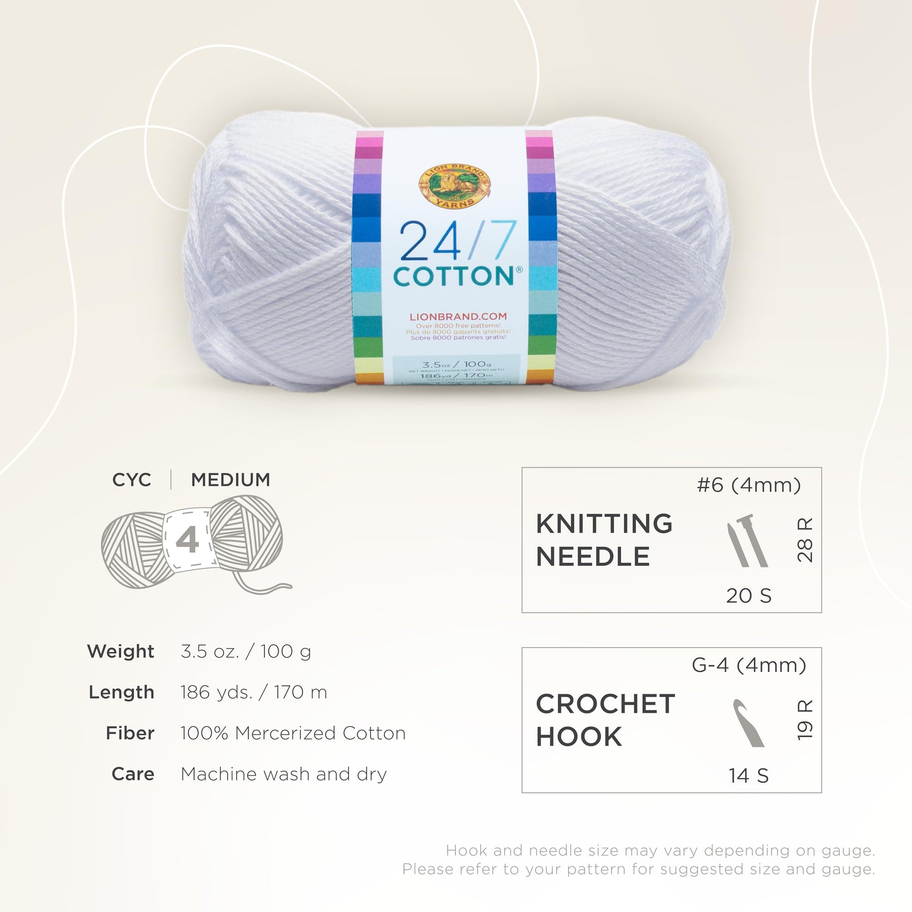 - Original Yarn – Lion Brand 24/7 Cotton Yarn, Lightweight Yarn for Knitting, Crocheting, and Crafts, White, 1 Pack by Lion Brand Yarn