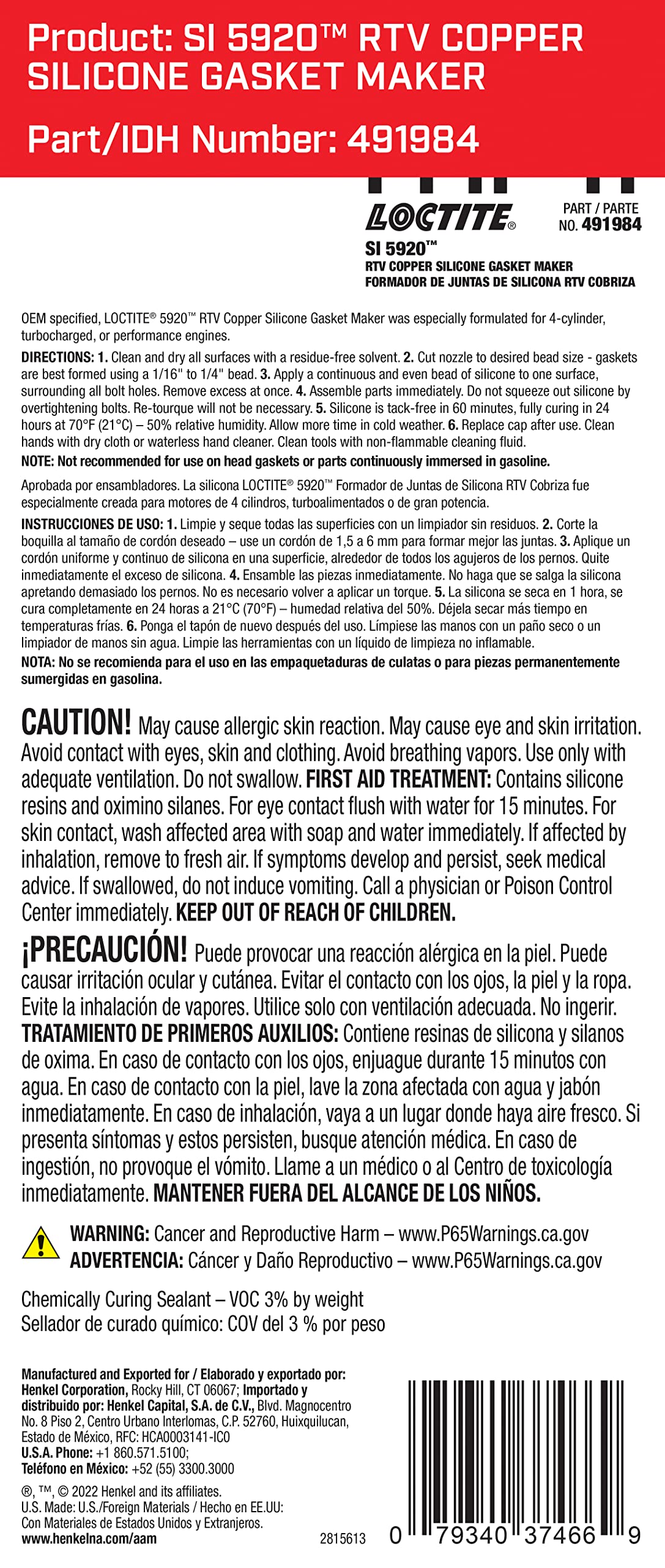 - Original Silicone – RTV 5920 Copper High Performance for Automotive: Sensor-Safe, Non-Corrosive, for Performance Engines, Oil Resistance, High-Temperature, Copper, 80 ml Tube (PN: 37466-491984) by Loctite