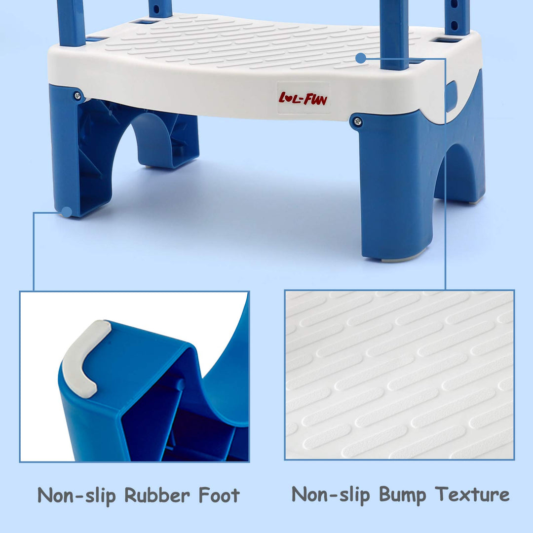 - STEP STOOL WITH HANDDLE: We add handdle design to the LOL-FUN toddler step stool,there are four heights that can be adjusted,help toddlers up and down the step stool.The curve design of the step stool for toddlers fits the toilet,suitable for most toilet