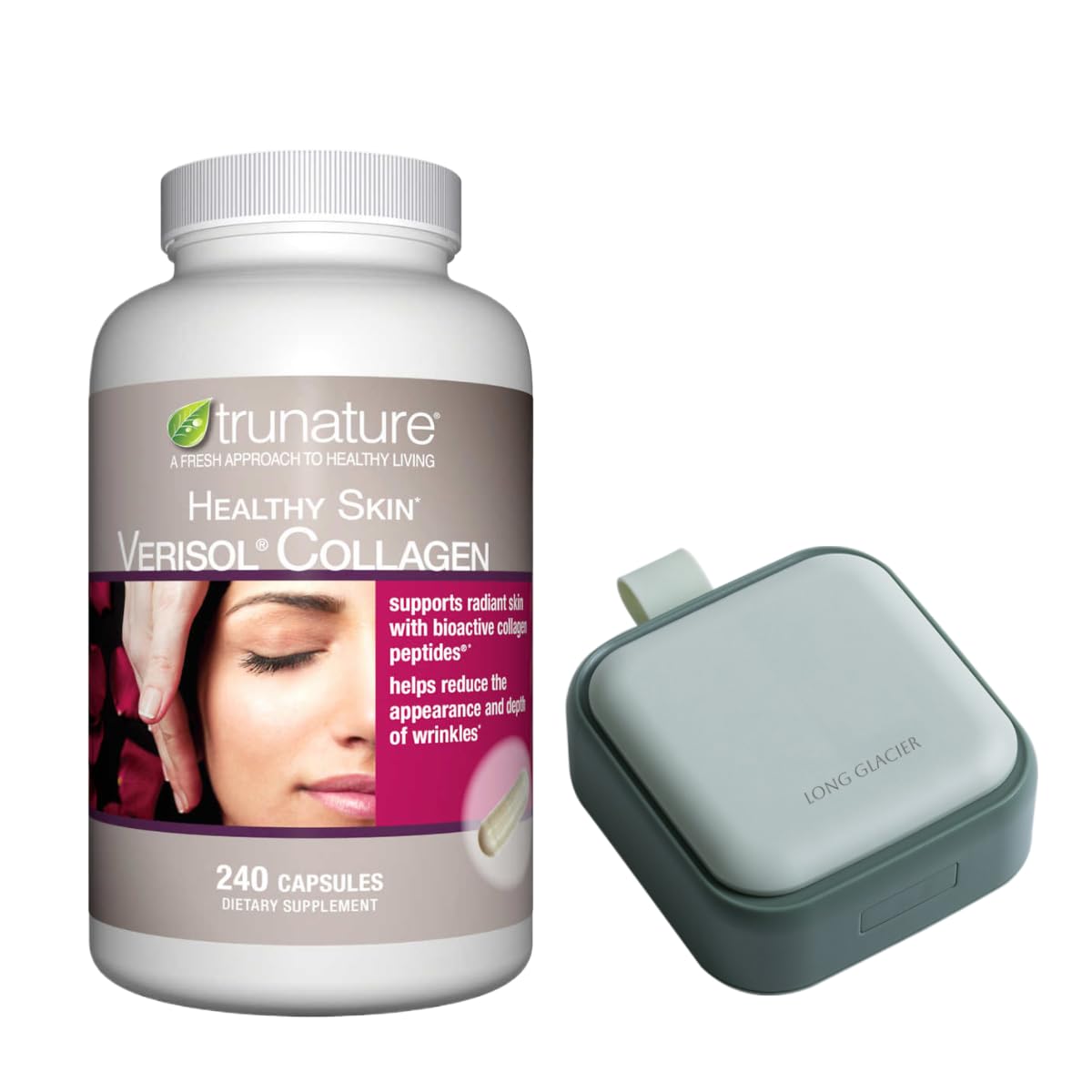 - This bundle include One trunature Healthy Skin Verisol Collagen, 240 Capsules and one Long Glacier Pill oragnizer.