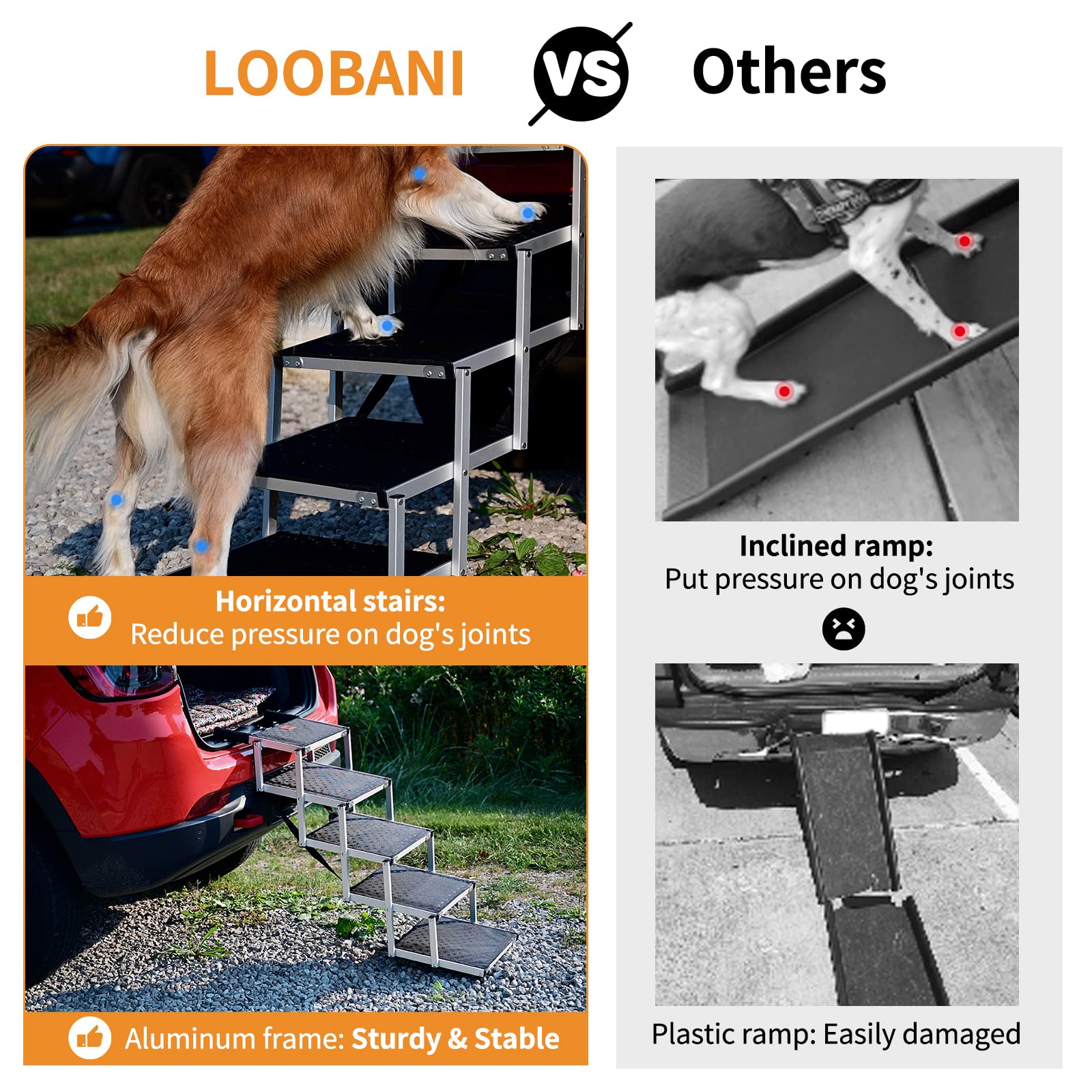 - STURDY and DURABLE--Compared with plastic ramps, LOOBANI dog ramp is made of rust-proof aluminum alloy overall frame, adds a thick board inside to prevent the surface to sink when dogs climb without anxiety, more stable to support UP to 200 pounds overweight furry friend.