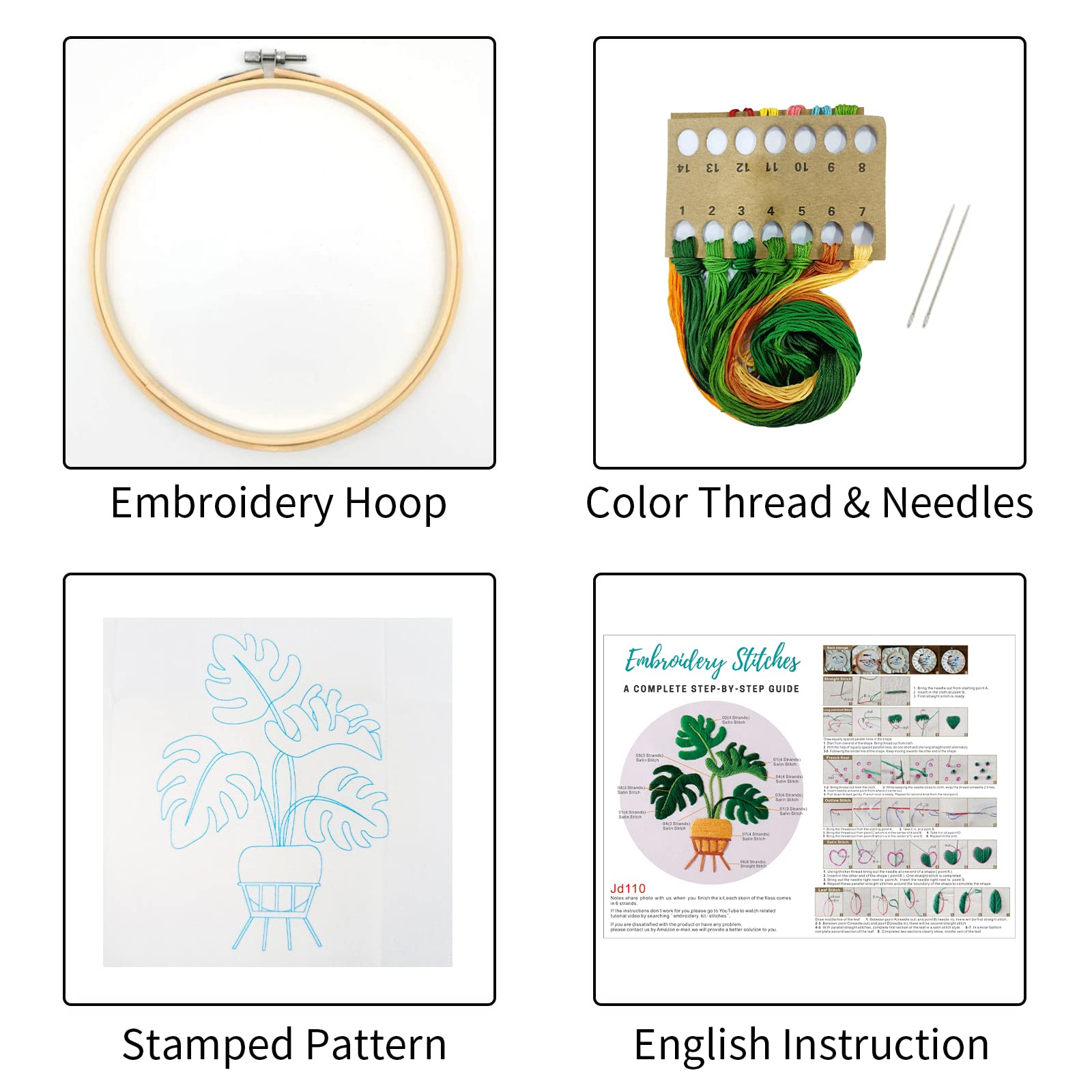 - Embroidery KitThis embroidery kit for Starters including 1 pcs embroidery cloth with Monstera pattern, 1 pcs plastic hoop(hoop size: 7.9 inch), 1 pcs English instruction, 2pcs needles, and enough color threads
