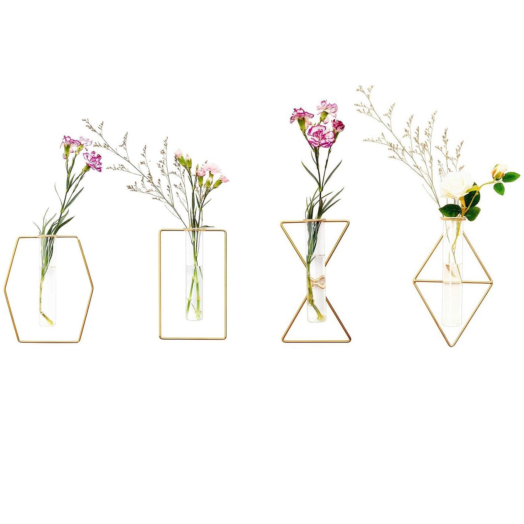 - GEOMETRIC DECORATIONS: These hanging flower vases have been designed into glass test tubes with geometric gold metal frames. With so many stylish elements, they're so pragmatic and decorative.